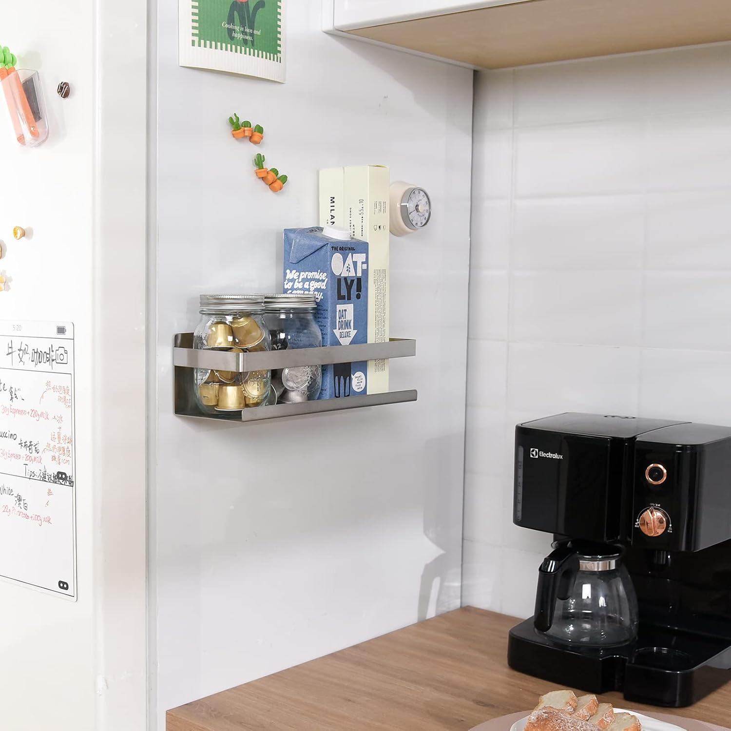 - Superior Magnetic Spice Rack: Made of high-quality sturdy thick metal steel, high temperature painted finish protects against rust. With super strong magnets on the back, supports up to 9 lbs without installation or assembly, just by attaching it to the side of the fridge, , and would not gradually slide down with time.