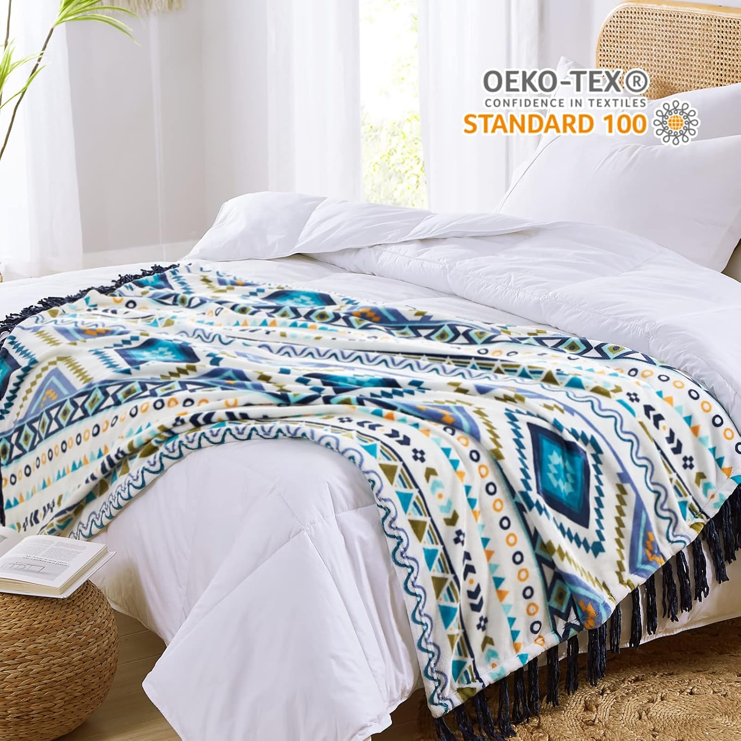 CASAAGUSTO Boho Throw Blanket - Blue and White Decorative Blankets with Tassel, Printed Flannel Bohemian Blanket for Chair, Bed, Sofa, Couch(50 * 60, Blue and White)