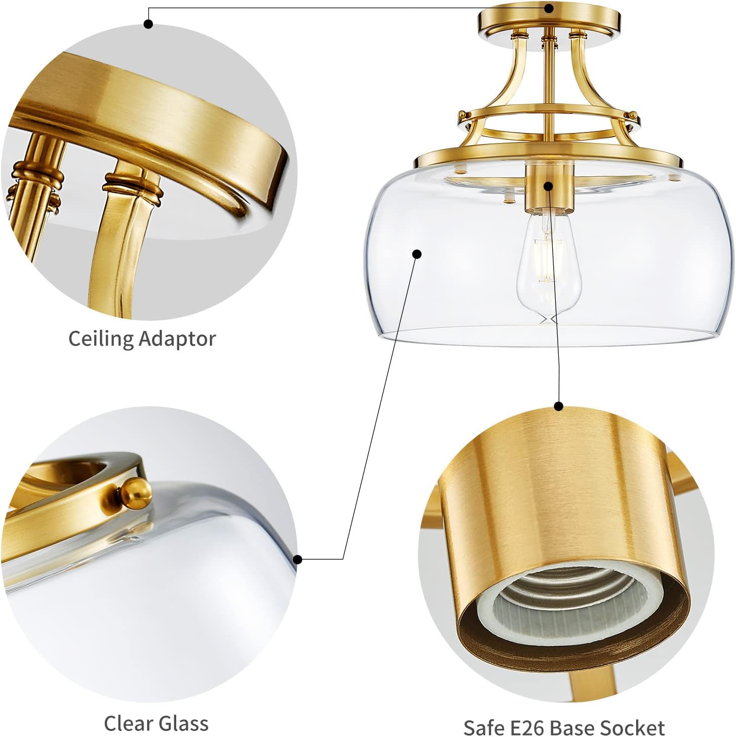 WUZUPS Chandelier Rustic Farmhouse Industrial Round Semi-flushmount Ceiling LED Light Fixture with Clear Glass Shades for Bathroom Kitchen Foyer Entryway, H 11.8" x W 13.4", E26 Base, Brushed Gold