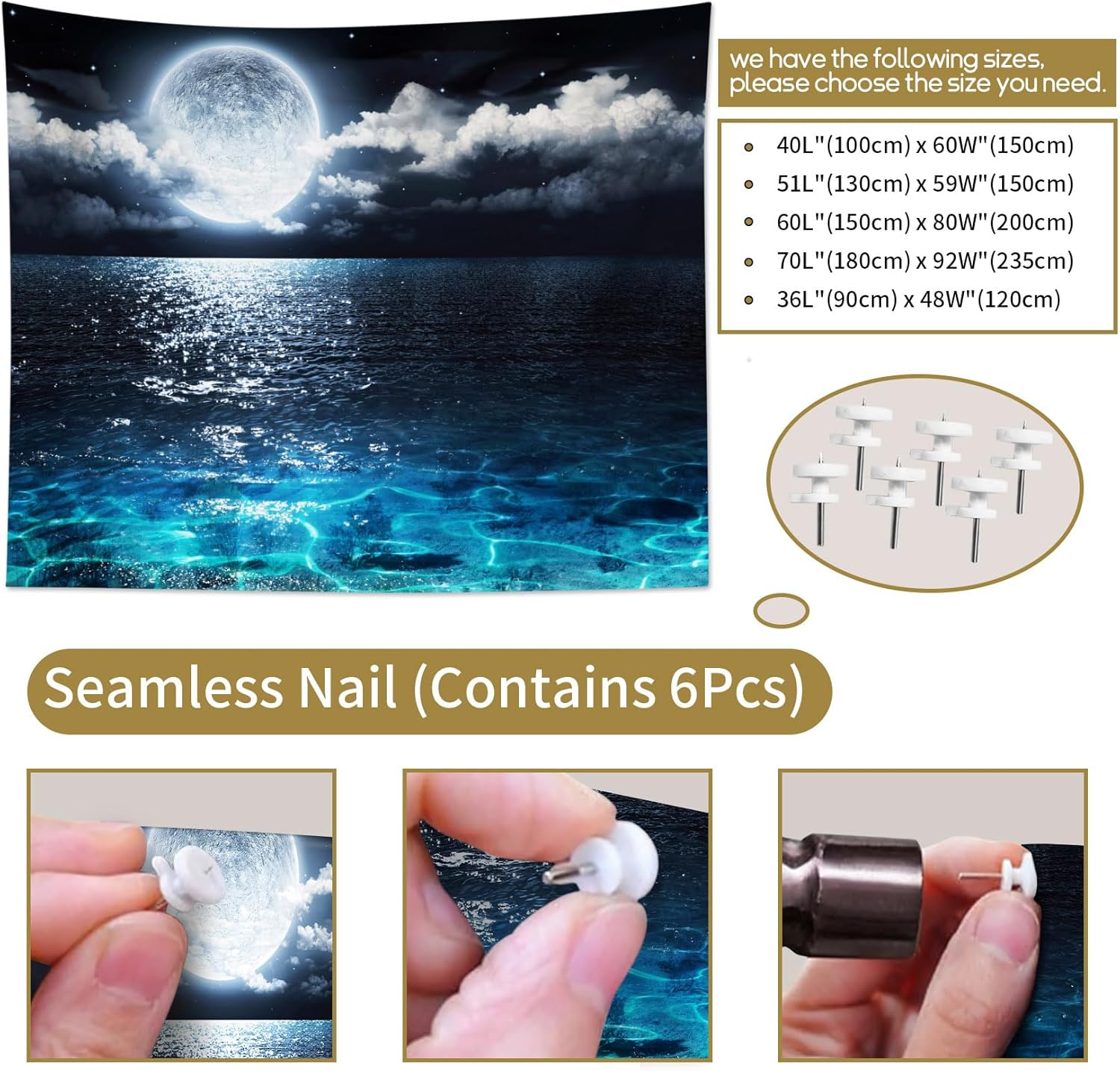 LB Moon Over Ocean Tapestry, Night Sky Tapestry Wall Hanging,3D Fantasy Psychedelic Watercolor Wall Art for Bedroom Living Room Dorm Home Decor,48 x 36 Inches
