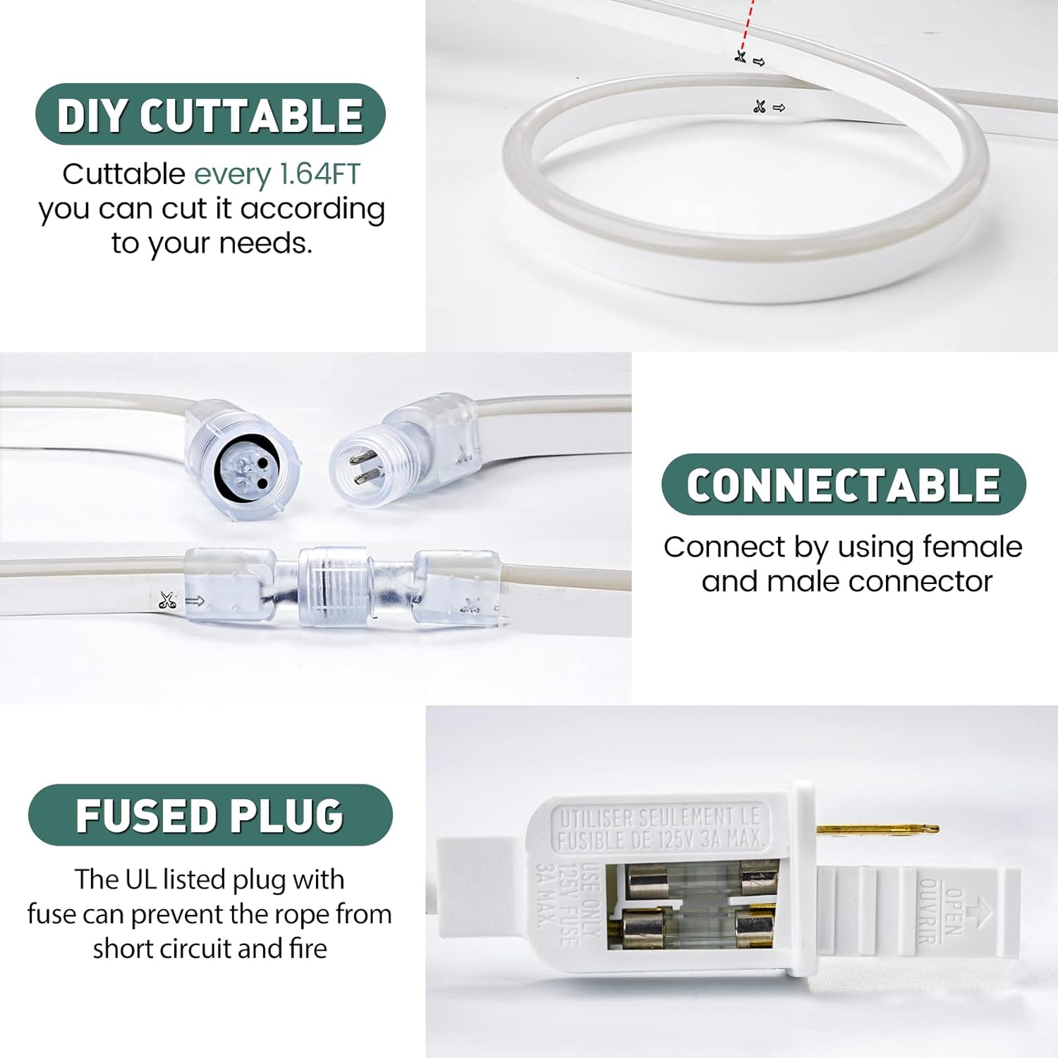- Cuttable & Connectable--GZBtech AC 110-120V outdoor waterproof led strip lights can be cut in every 20inches/0.5m along the cutting marks, you can cut it according to your needs. By using male and female end-to-end for easy connection,plug and play without wiring. This is a 0.31''(W)x0.63" (H) heavy-duty rope light. If you need a smaller neon strip with higher lumens, please click visit the store on the top of this page to view it.