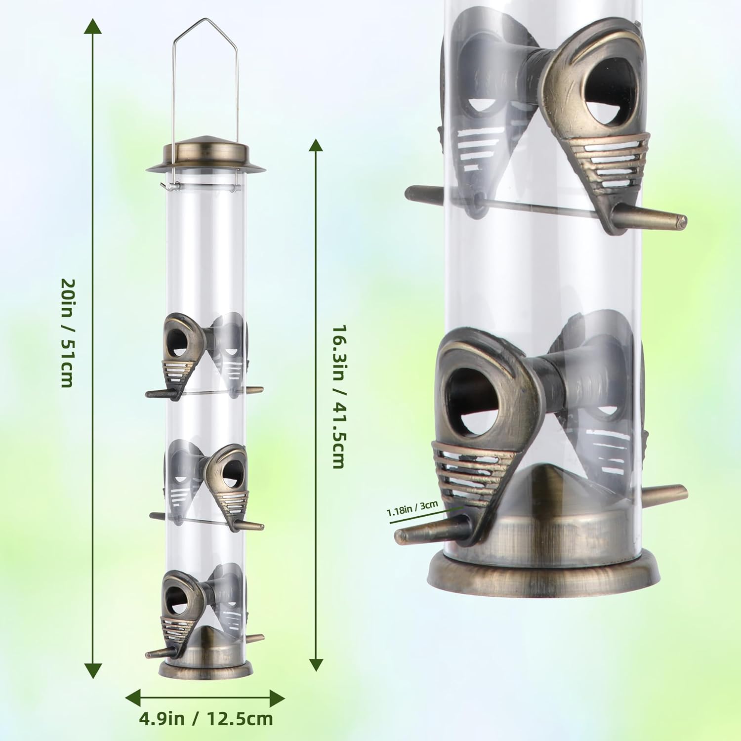 - Dimension of bird feeders for outdoors hanging: The size of tube bird feeders for outdoors hanging is 5 x 5 x 20 inch.You can use outdoor bird feeder easily without installing any tools, and you can also move it freely