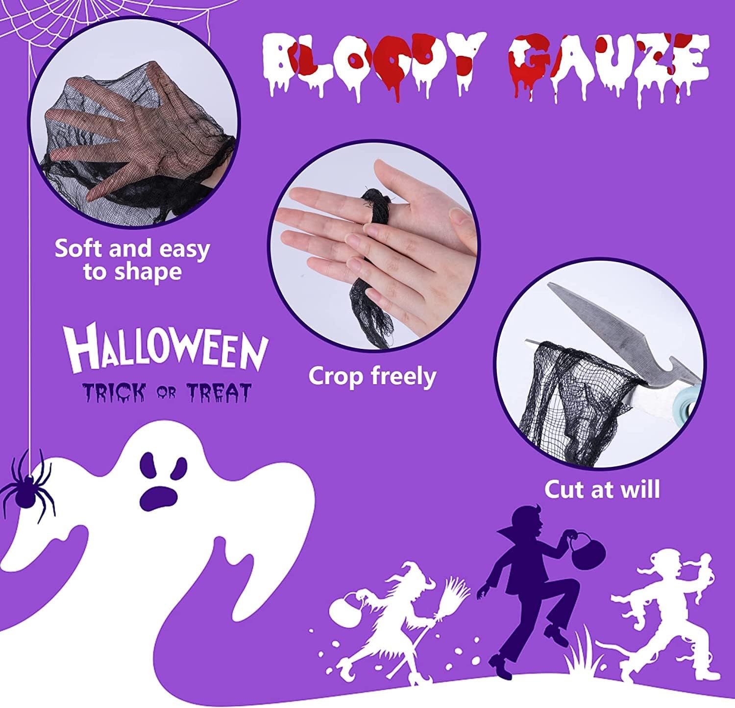 - Application scenarios:You can use the creepy gauze to decorate doors, window, bathrooms, porches and walls when holding Halloween parties, midnight thriller challenge activities, etc. It provide a better atmosphere for scary scenes .