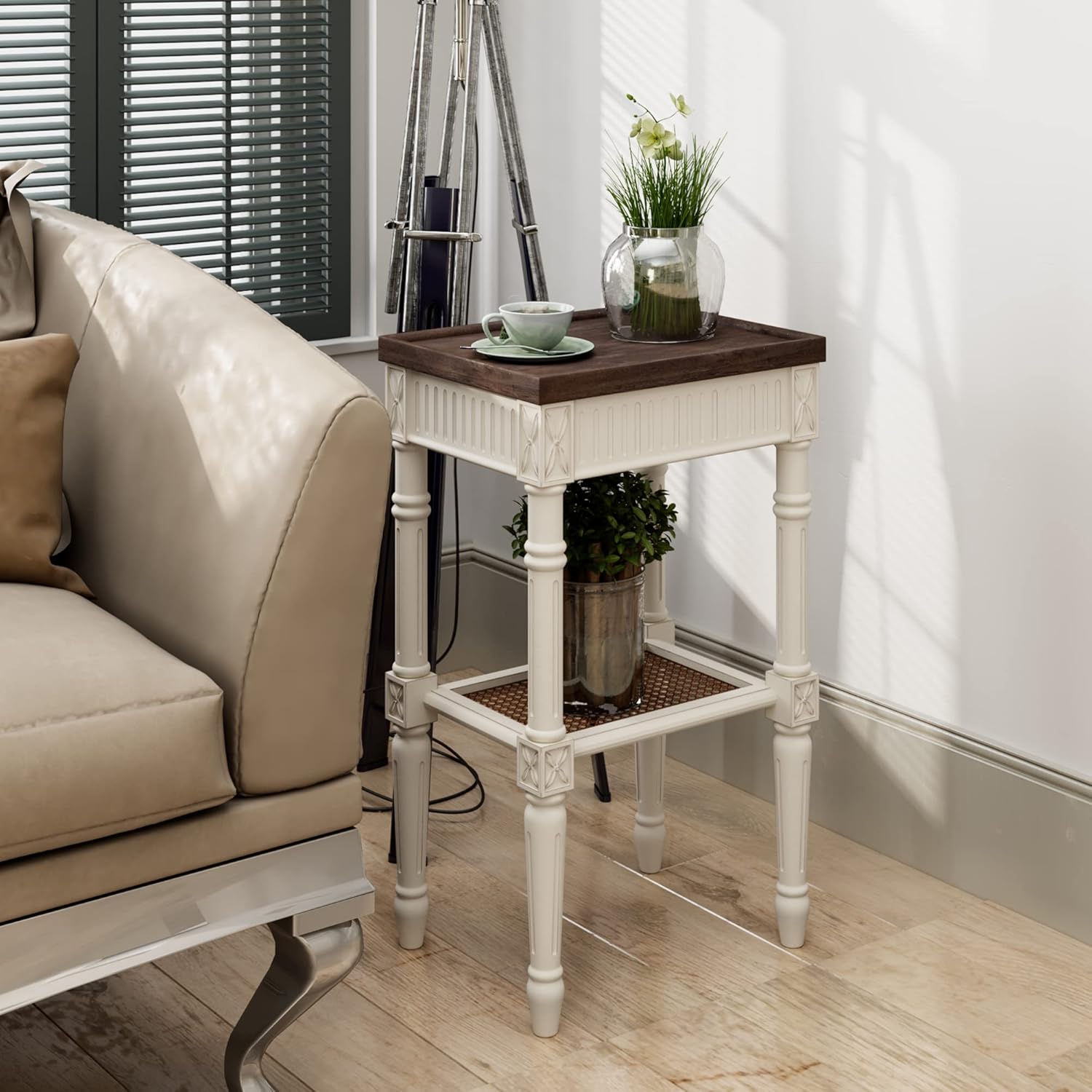 - DESIGNER STYLE: Whether flanked on either side of your sofa, or placed next to an accent chair in the living room, this french country distressed end table is your trusty sidekick with the low-key silhouette and rich detailed features.