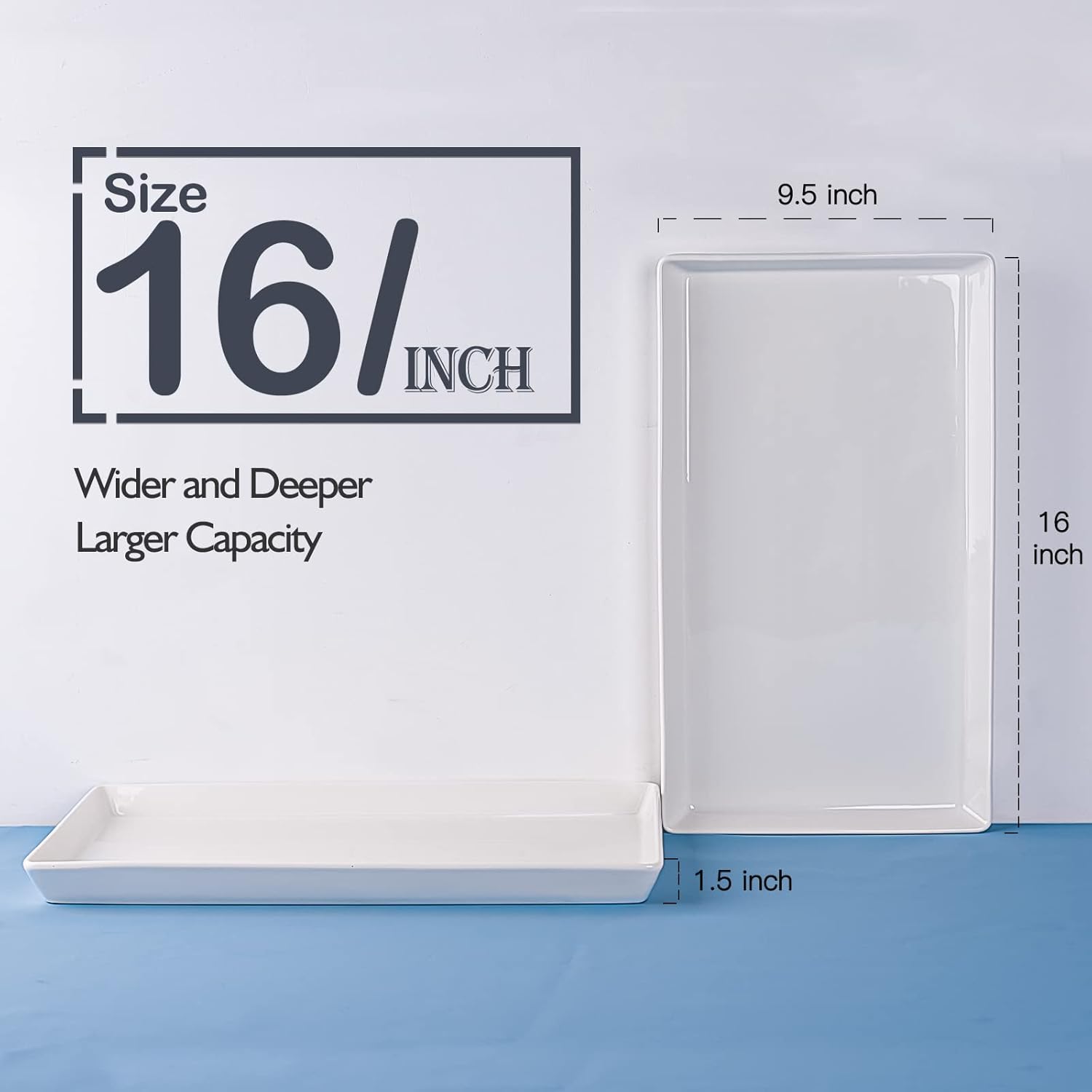 - Ample Surface Area Design: With 16" x 9.5" of surface area, it is large enough to accommodate a large Thanksgiving turkey. Rectangular tray design makes it stable and outstanding from others. No-spilling edge design to prevent food runaway. The white color fits all decorations and is a timeless classic.