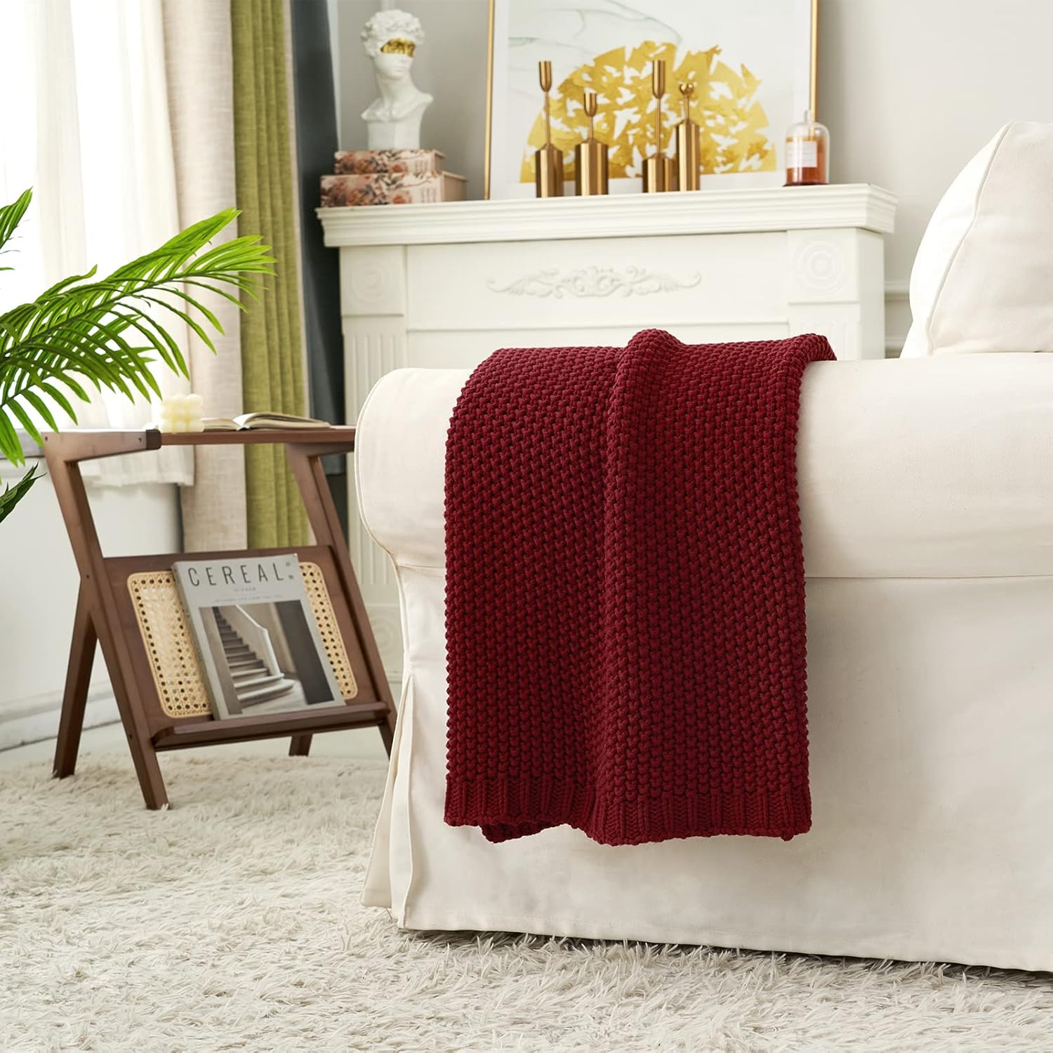 Chunky Cable Knit Throw Blanket Lightweight Wine red 100% Organic Cotton Blanket for Sofa Couch Bed Baby Nursery, Rustic Shabby Chic Modern Farmhouse, 60” x 80” Give Laundering Bag