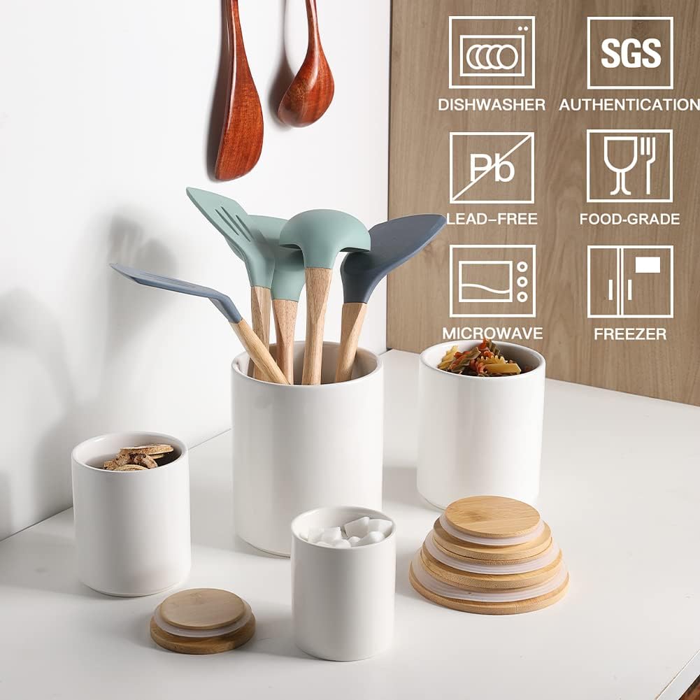 Sweejar Ceramic Canisters Set, Food Storage Jars with Airtight Seal Bamboo Lid, Stackable Containers for Kitchen Counter, Ground Coffee, Flour, Sugar, Cookie, Dog Treats, Candy, Pack of 4 (White)
