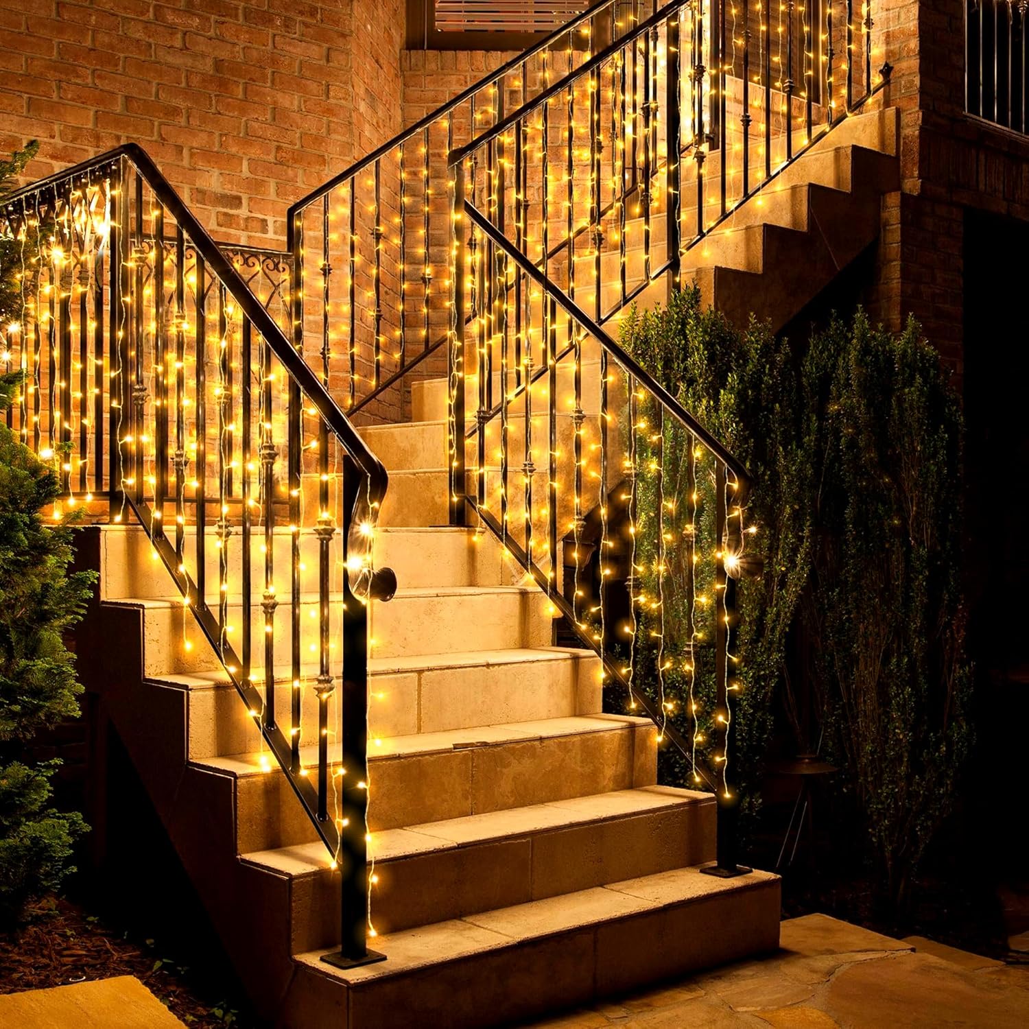 - CURTAIN LIGHTS OUTDOOR: 15ft × 3.3ft curtain lights create a stunning waterfall effect for balconies, guardrails, patios, and gardens. Their durable, weather-resistant construction ensures long-lasting performance in various climates, while the warm white LEDs add a cozy ambiance to any outdoor space