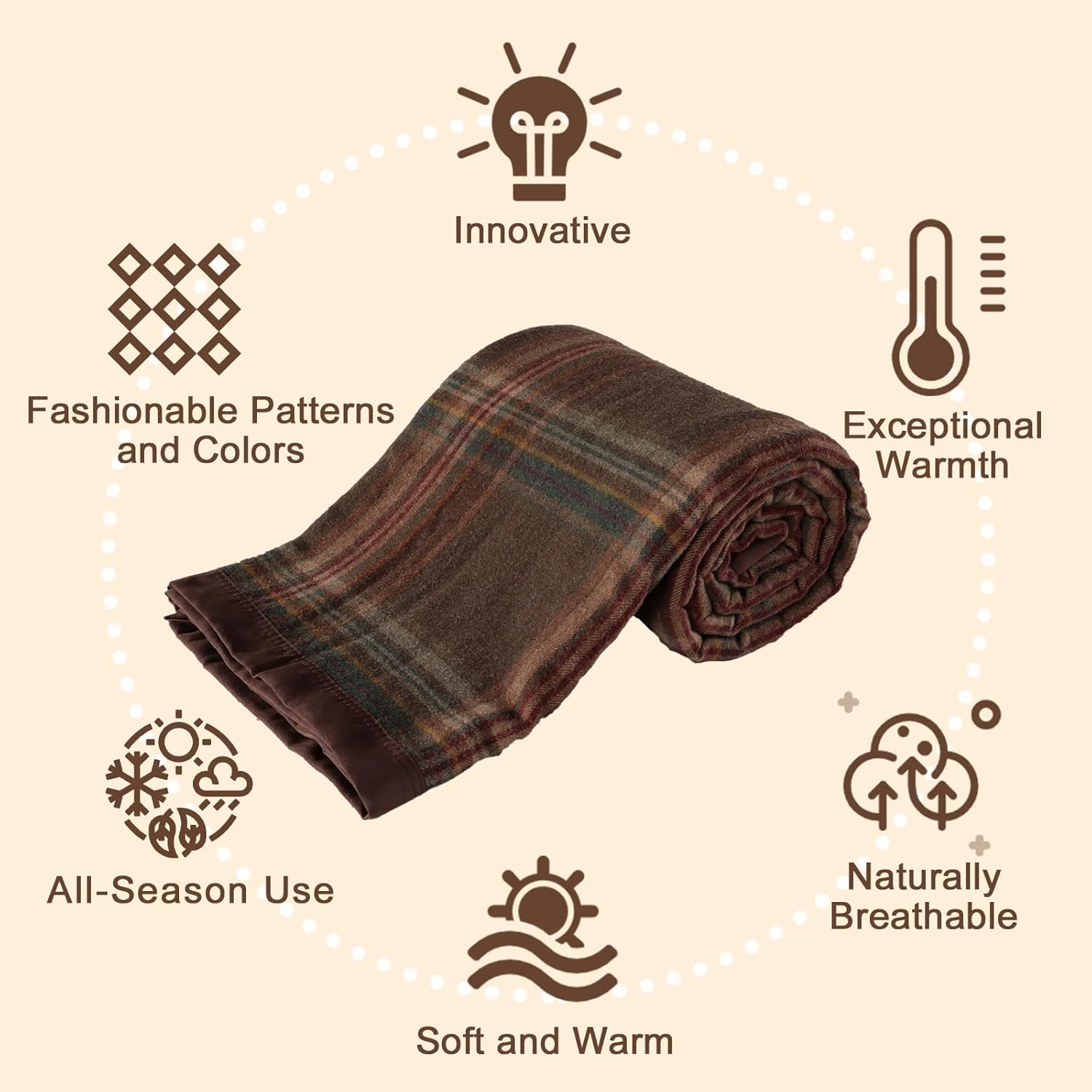 YOUR MOON 100% Pure Merino Wool Queen Size, Australian Organic Natural Wool Blanket, Hypoallergenic Wool Blanket for Bed, Medium Weight(Plaid Brown, 90 * 90)