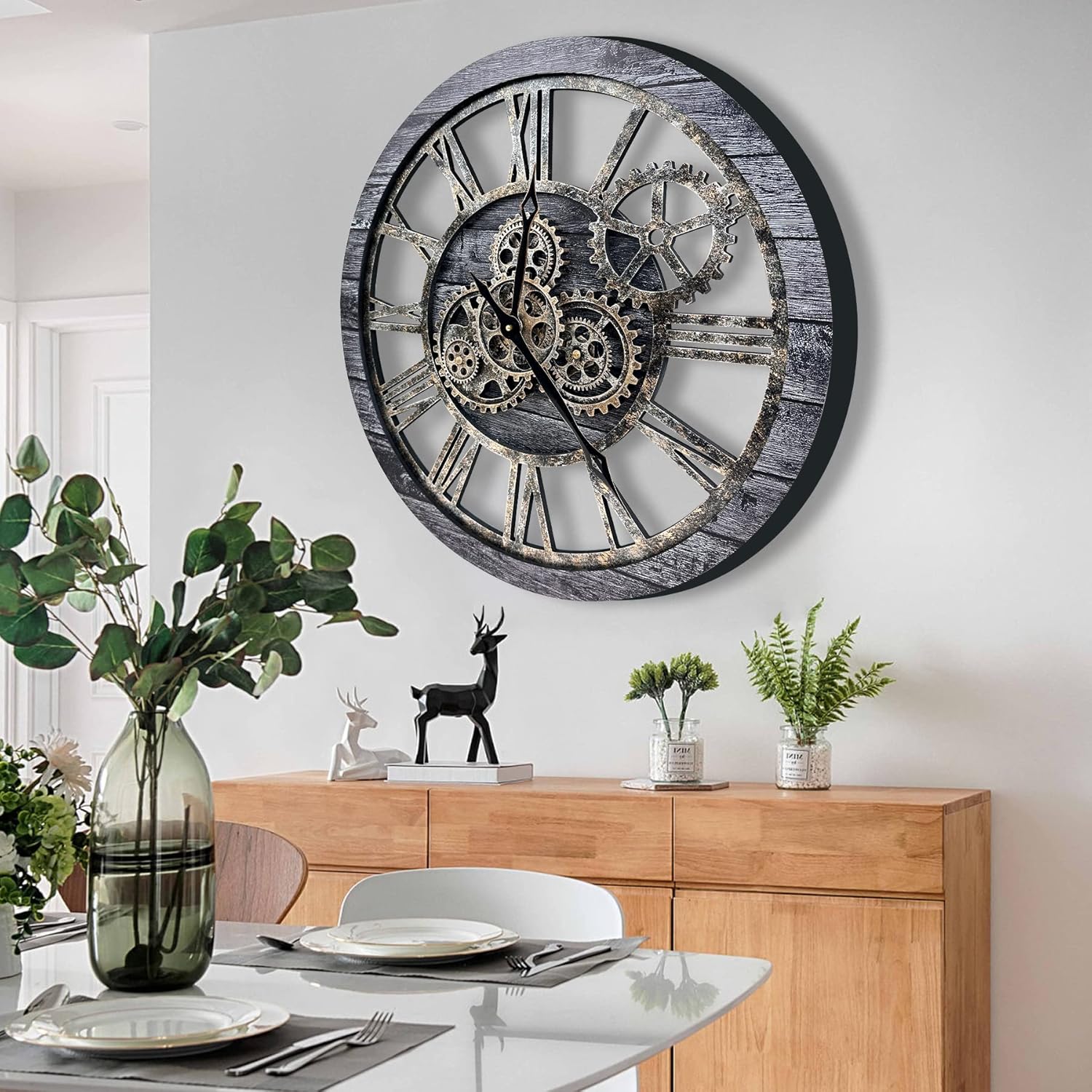 The B-Style Large Wall Clock 24 inch Moving Gear Wall Clock Oversized Vintage Farmhouse Wall Clocks for Living Room Decor Decorative Rustic Industrial Wood Clock (Carbon Gray)