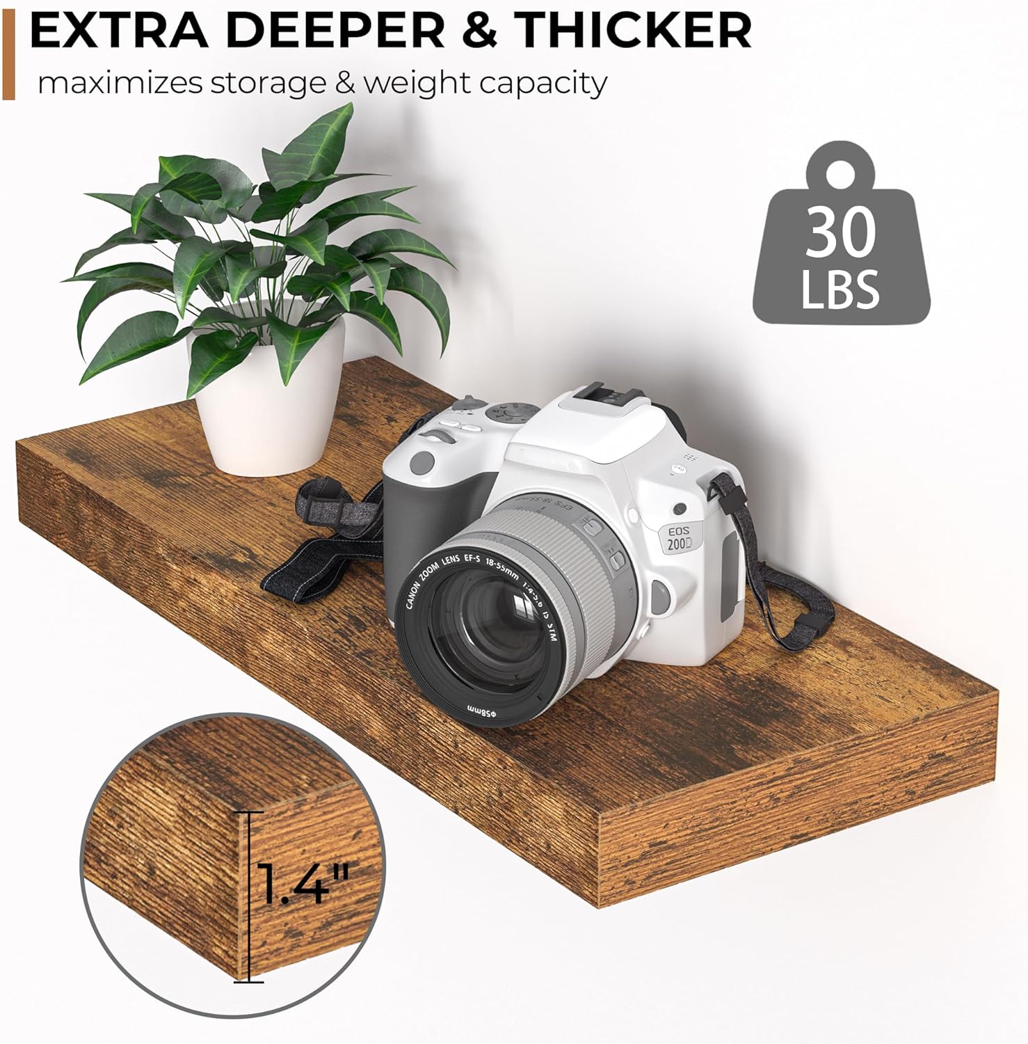 - Extra Deeper & Thicker - Each board measures 16"W x 6.7"D x 1.4"H. Extra deeper and thicker design in order to bring maximizes storage space and weight capacity, even hold up to 30 lb each. This floating shelf taking up zero square feet, reduces clutter and highlights décor in compact spaces.