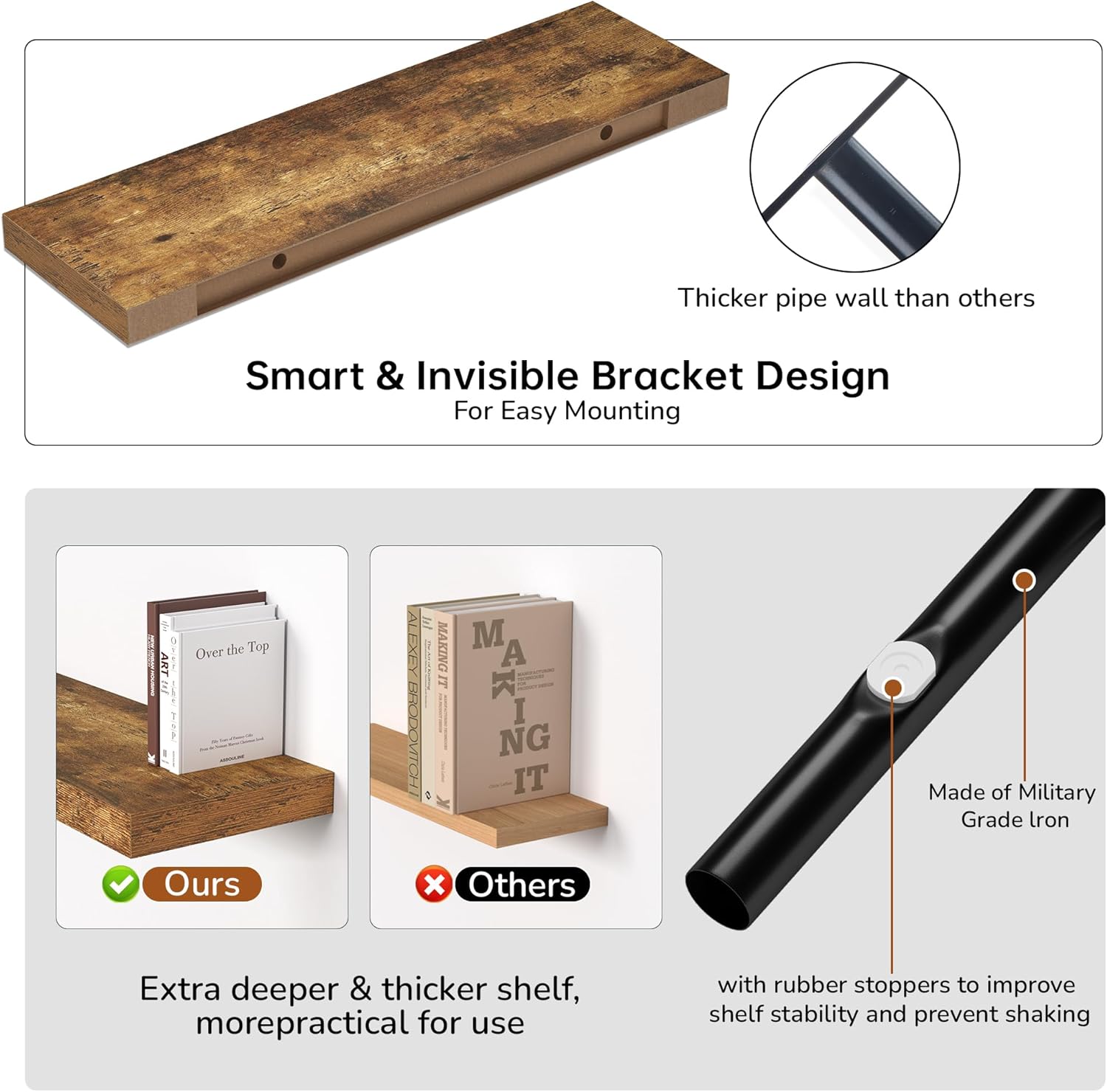 Floating Shelves - 10.3 Inch Deep Wall Shelf for Decor & Storage - Wall Mounted Display Shelving with Invisible Heavy-Duty Metal Bracket - 36" W x 10.3" D x 1.8" H - Set of 1 - Rustic Brown