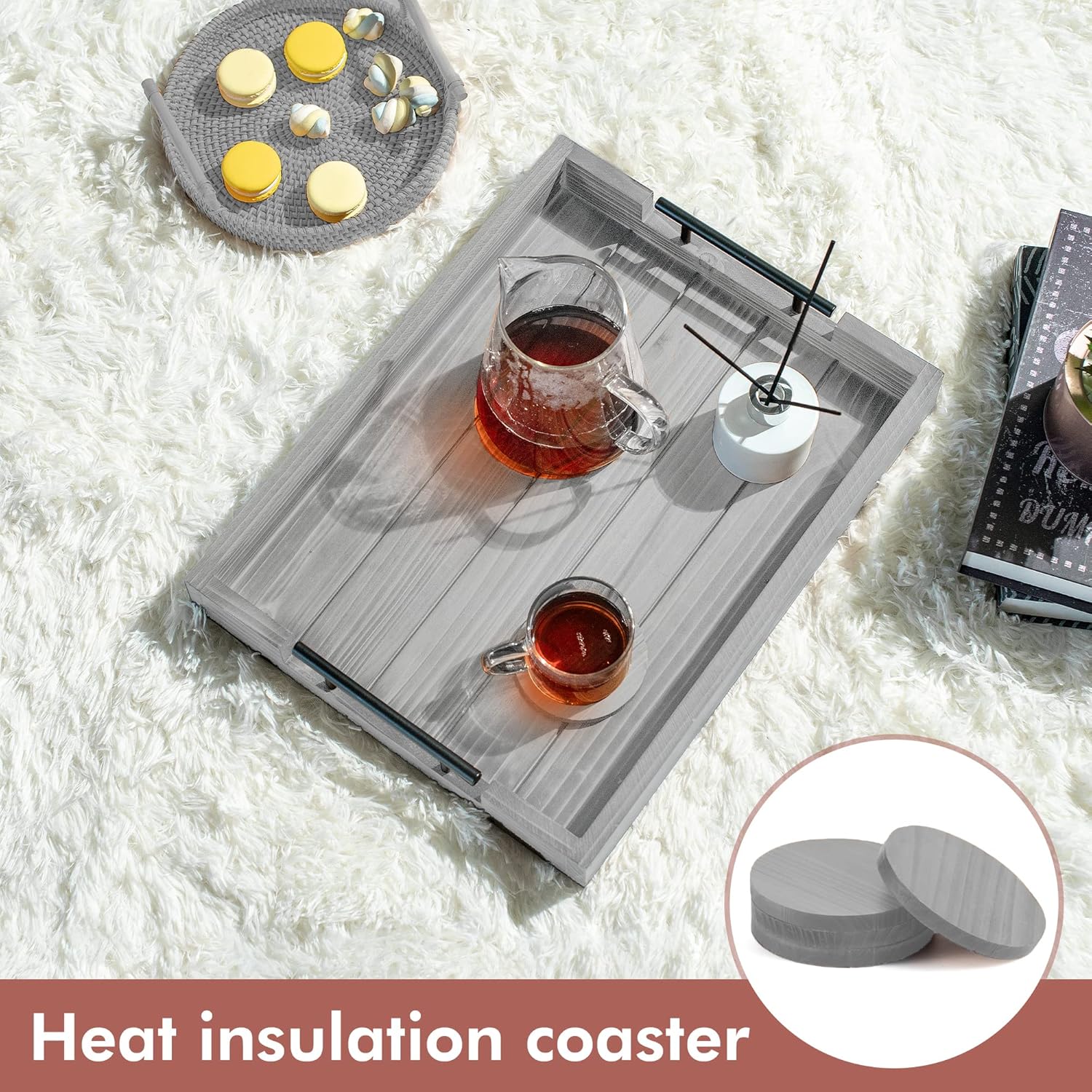 - INCLUDED WOODEN COASTERS SET OF 4 – Along with our wooden serving trays, we also provide a set of 4 natural wooden coasters that have a tasteful torched appearance. These wooden coasters for drinks are the best way to protect your tables from spills, mess, and stains while also adding a decorative element to your home, uplifting the overall aesthetic appeal – MUST HAVE ottoman tray with handles can be used as a Drink Tray!
