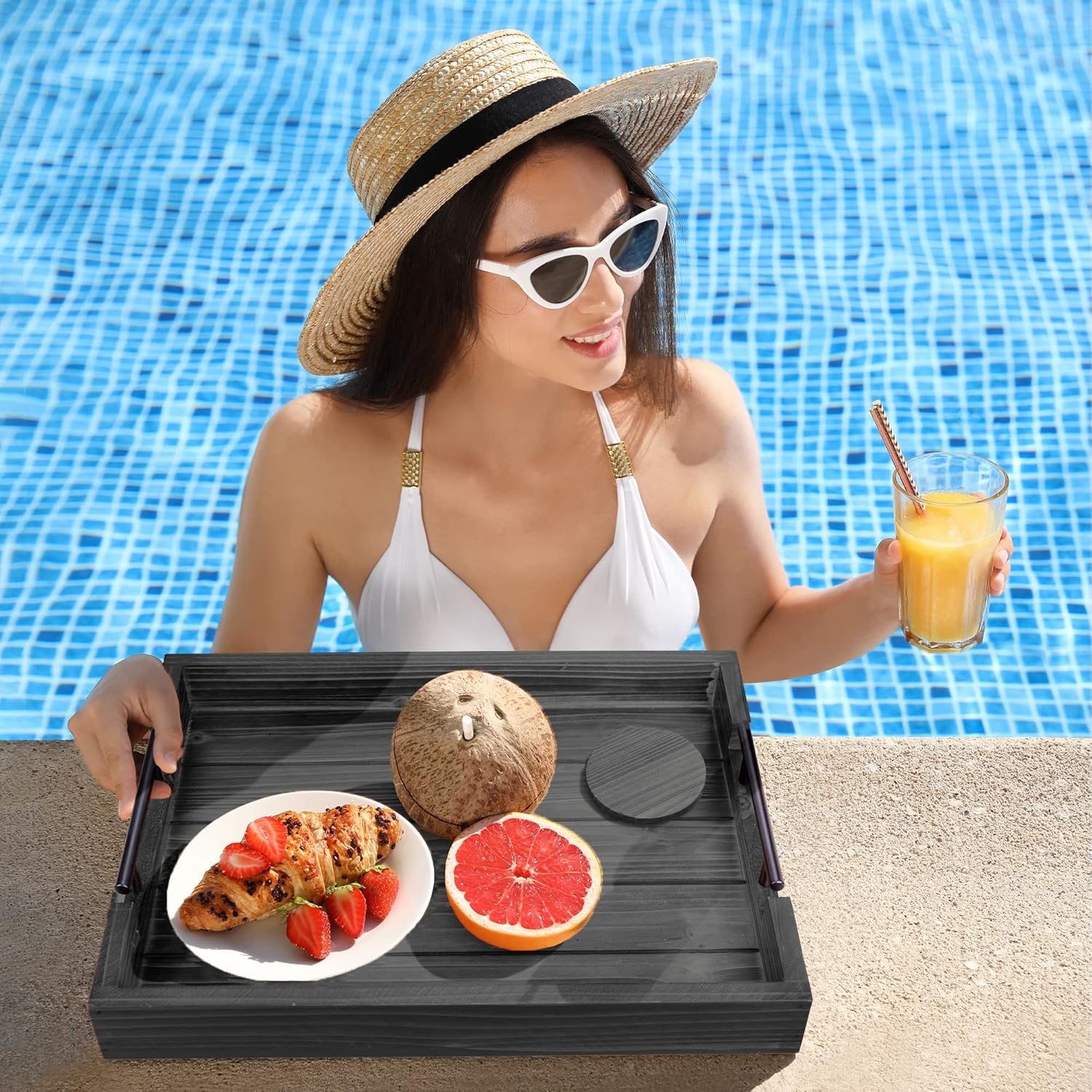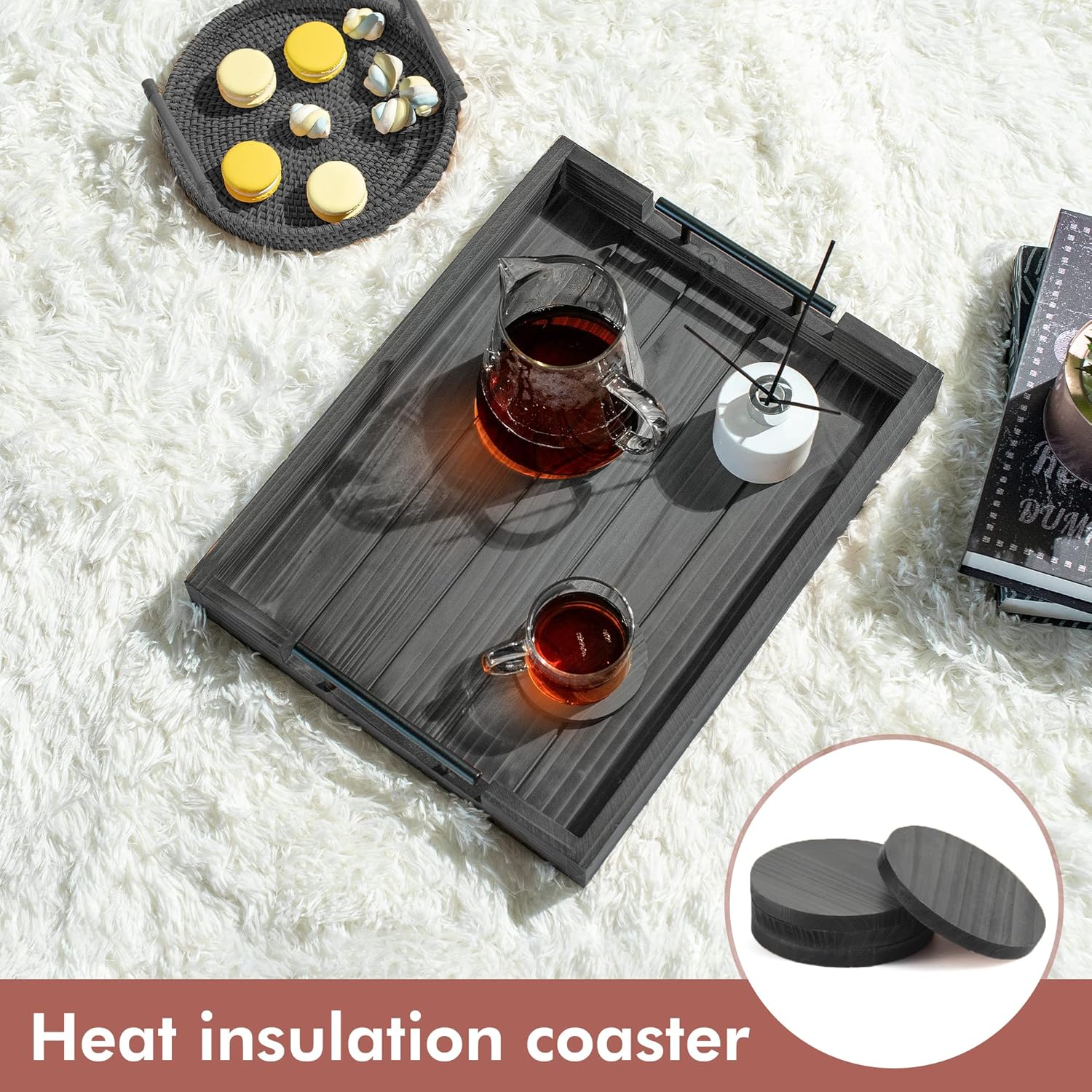 - INCLUDED WOODEN COASTERS SET OF 4 – Along with our wooden serving trays, we also provide a set of 4 natural wooden coasters that have a tasteful torched appearance. These wooden coasters for drinks are the best way to protect your tables from spills, mess, and stains while also adding a decorative element to your home, uplifting the overall aesthetic appeal – MUST HAVE ottoman tray with handles can be used as a Drink Tray!