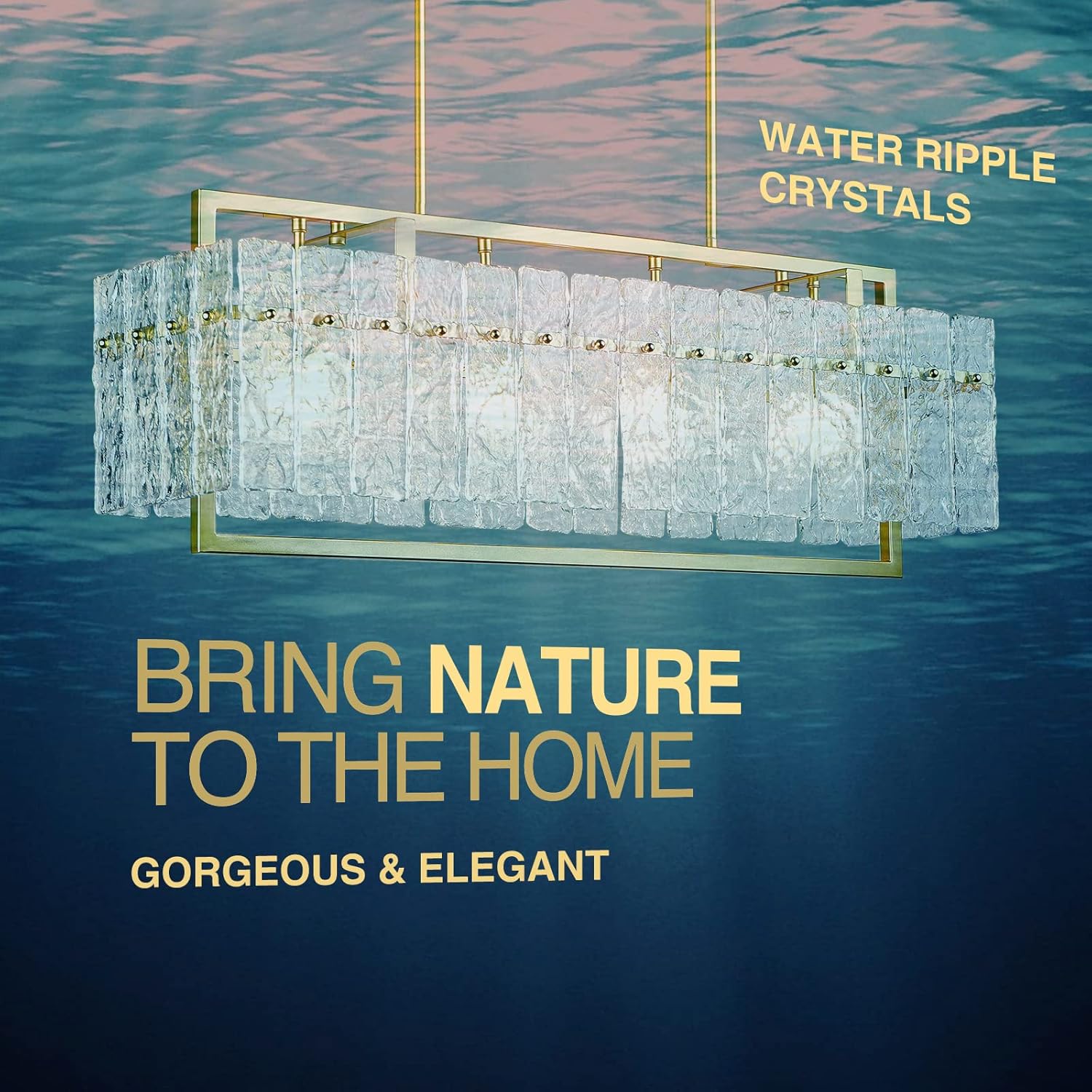 IKK Modern Gold Rectangle Chandeliers for Dining Room, Crystal Water Ripple Light Fixture, Elegant Farmhouse Linear Lighting for Kitchen Island, Bar Table, L33 x W9 x H12