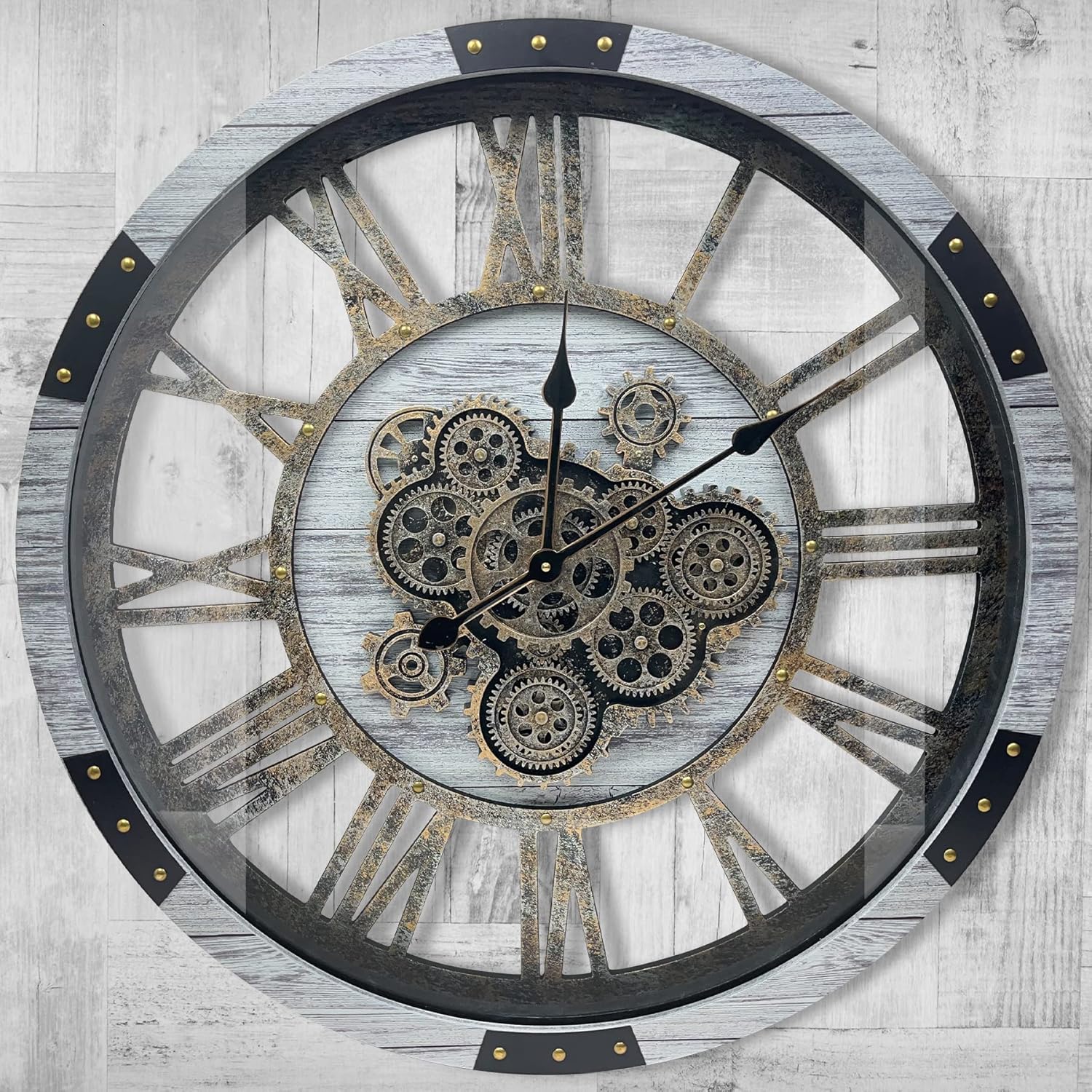 - đ§ăReal Moving Gears Wall ClockăThe rustic wall clock is design with multi-real moving gears, put battery in, various gears start working, makes a subtle relaxing sound and makes a living element in the environment in where it is placed, vintage and magical, catch all eyes of visits.