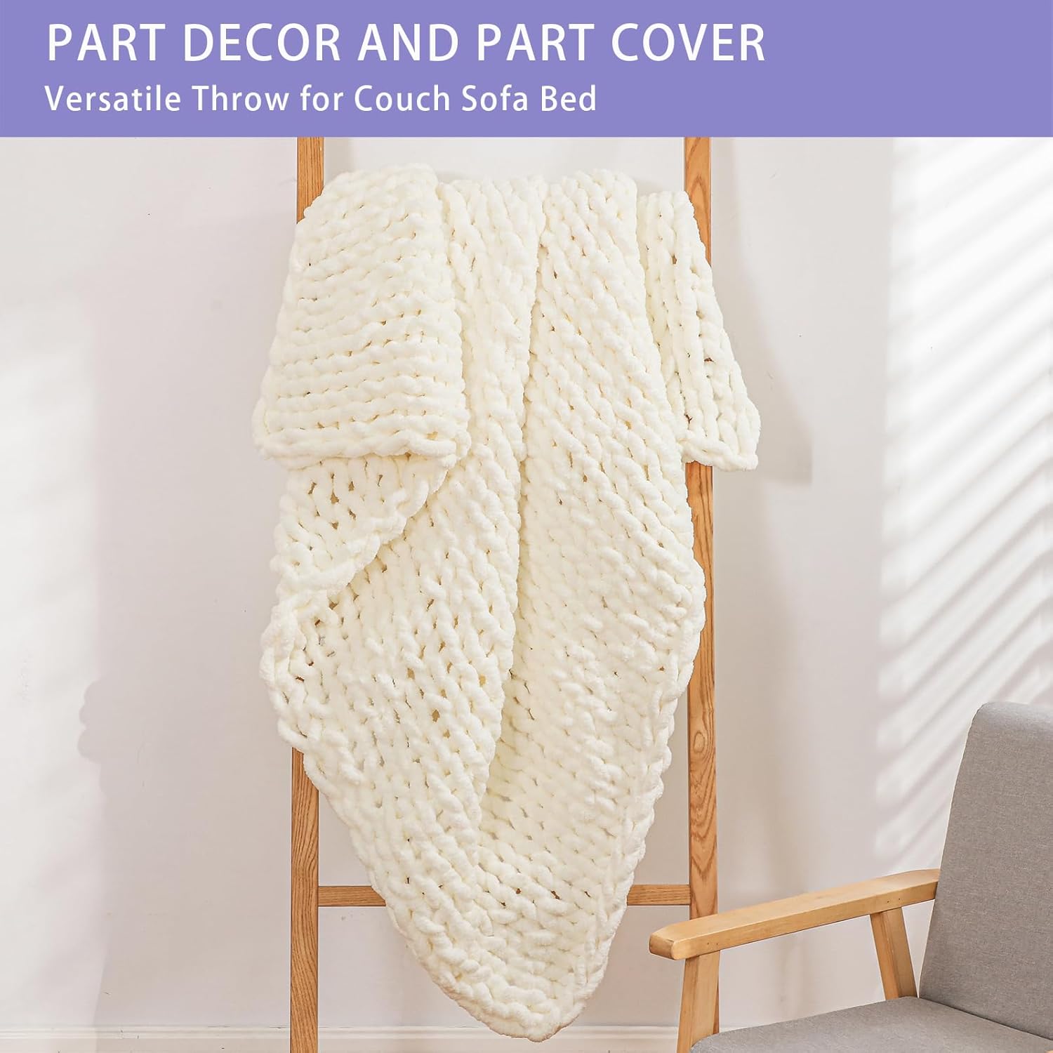 Bigacogo Chunky Knit Throw Blanket for Couch, 40x80 inches, 100% Hand Knitted with Thick Jumbo Chenille Yarn, Cozy Soft Large Rope Knot Cable Crochet Blankets for Sofa Bed Living Room, Ivory