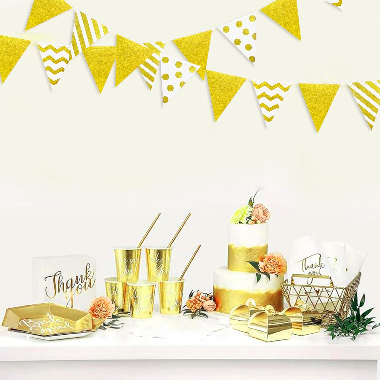 - Special design: This white and gold pennant banner is alternately composed of 3 patterns ( gold stripe, gold wave, gold polka dots) with glitter gold paper and white cardstock. The flag is neatly cropped and is the perfect choice for a white and gold theme background decorations.