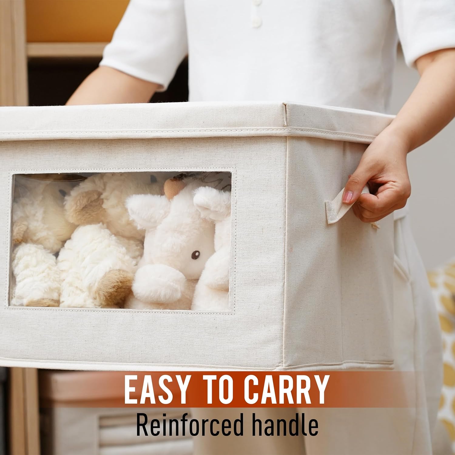 - 【Sturdy and Durable】Our fabric storage box with lid is crafted from durable, breathable fabric and cardboard. The latest materials are odorless and have a long service life. Designed with sturdy handles sewn onto the cardboard, this box is ideal for carrying heavy loads and for your long term storage needs.
