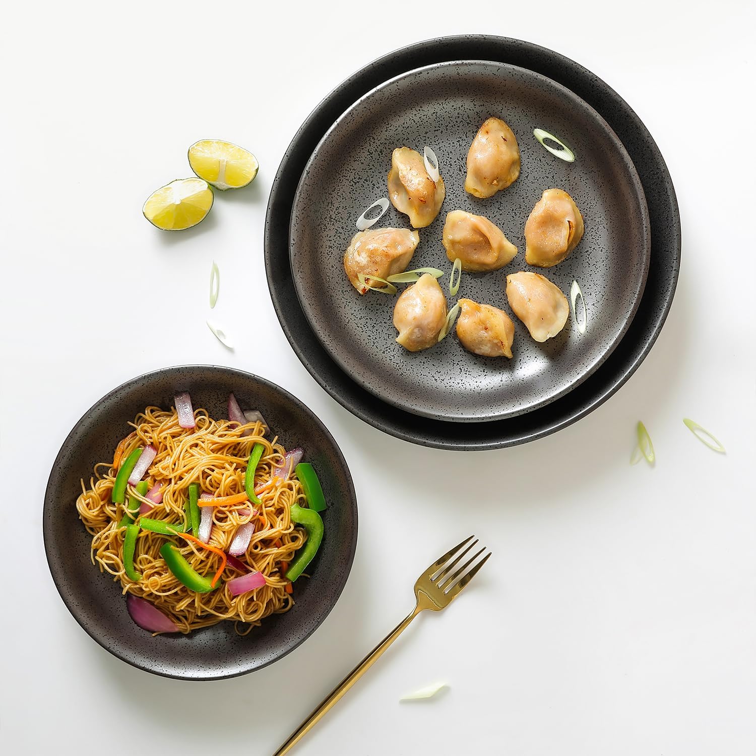 - ELEGANT COLOR PALETTE: A decadent dark brown color is accented by a metallic grey illusion and black speckles, making this dinnerware set feel warm and inviting to your dinner guests.