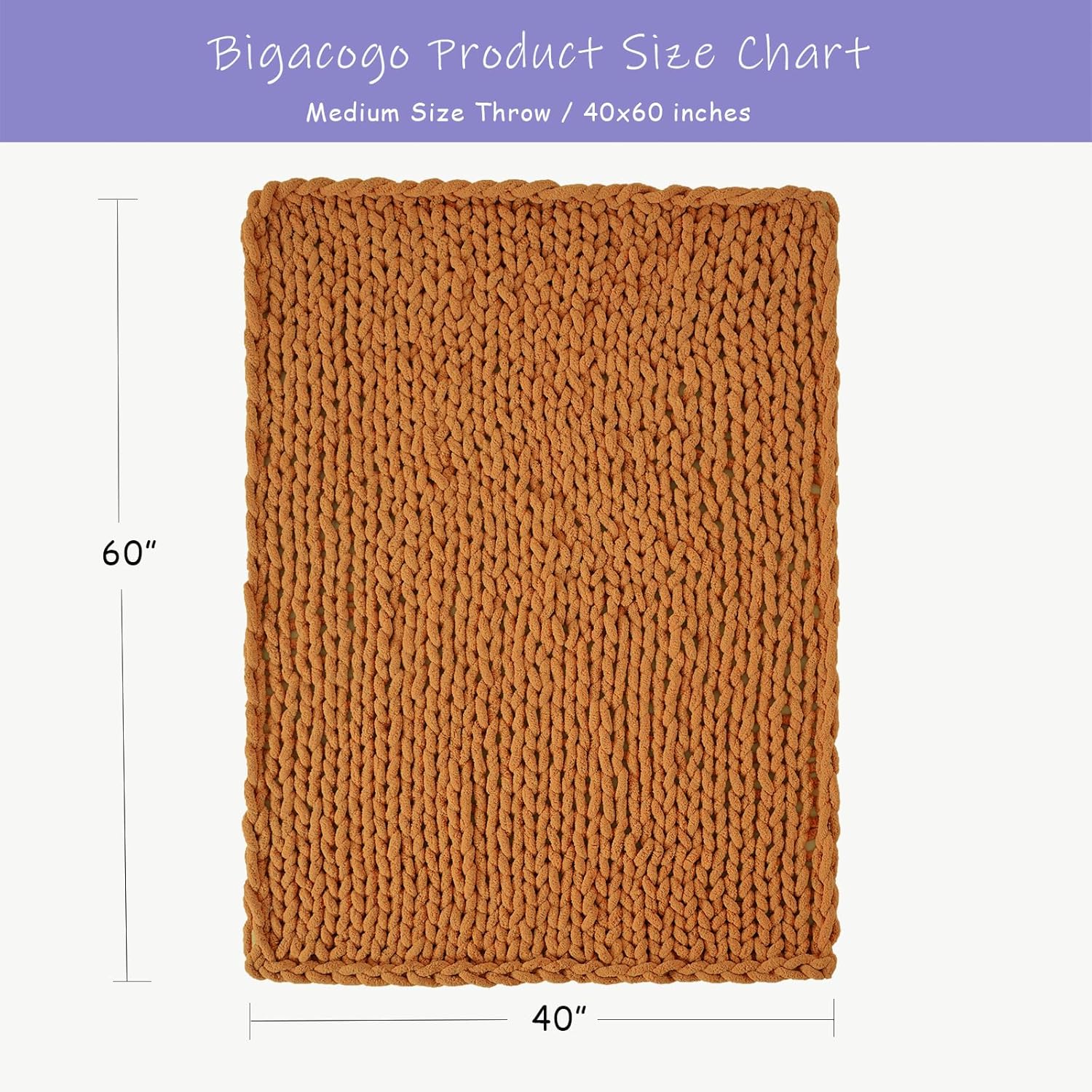 Bigacogo Chunky Knit Throw Blanket for Couch, 40x60 inches, 100% Hand Knitted with Thick Jumbo Chenille Yarn, Cozy Soft Large Rope Knot Cable Crochet Blankets for Sofa Bed Living Room, Burnt Orange