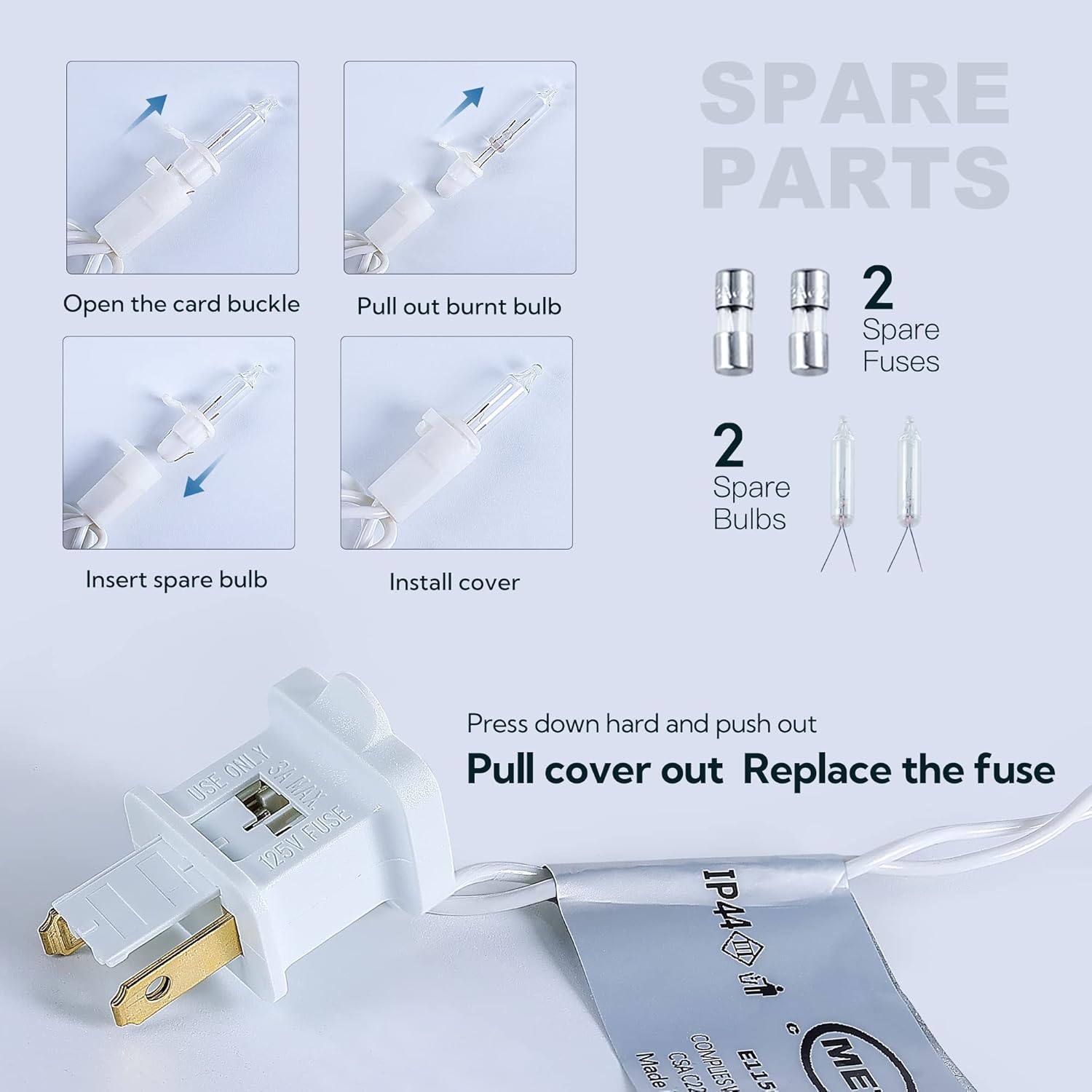 - ⛄Unique Design incandescent mini Lights: The bulb has a snap-on design and is very easy to replace. When one of our bulbs breaks, it doesn't affect the other bulbs. This is a very special design. You can replace damaged bulbs individually with the spare bulb or fuse provided by us.
