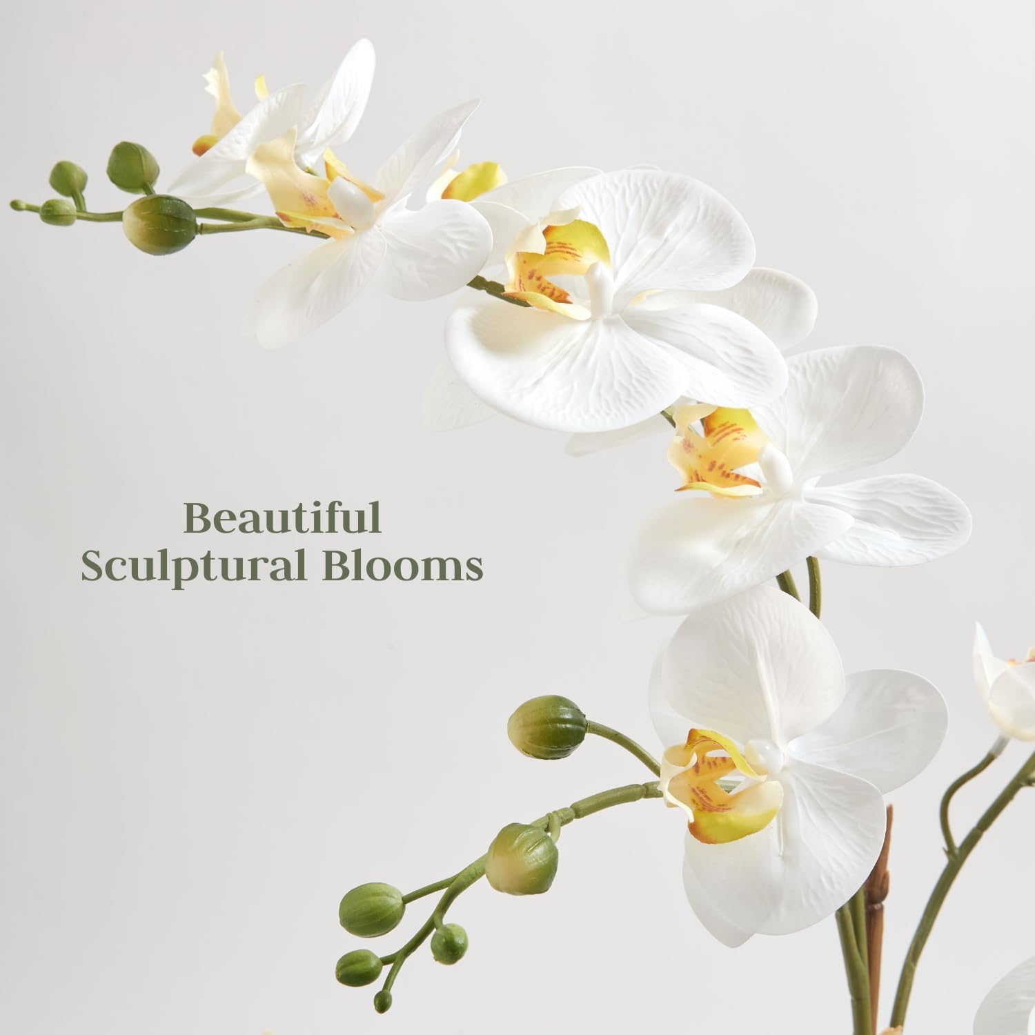 - HIGH-QUALITY MATERIALS: The durable grey colored pot and beautiful lifelike white orchid blooms combined with foilage and succulents with wire stems will shape your plant as desired for years to come.