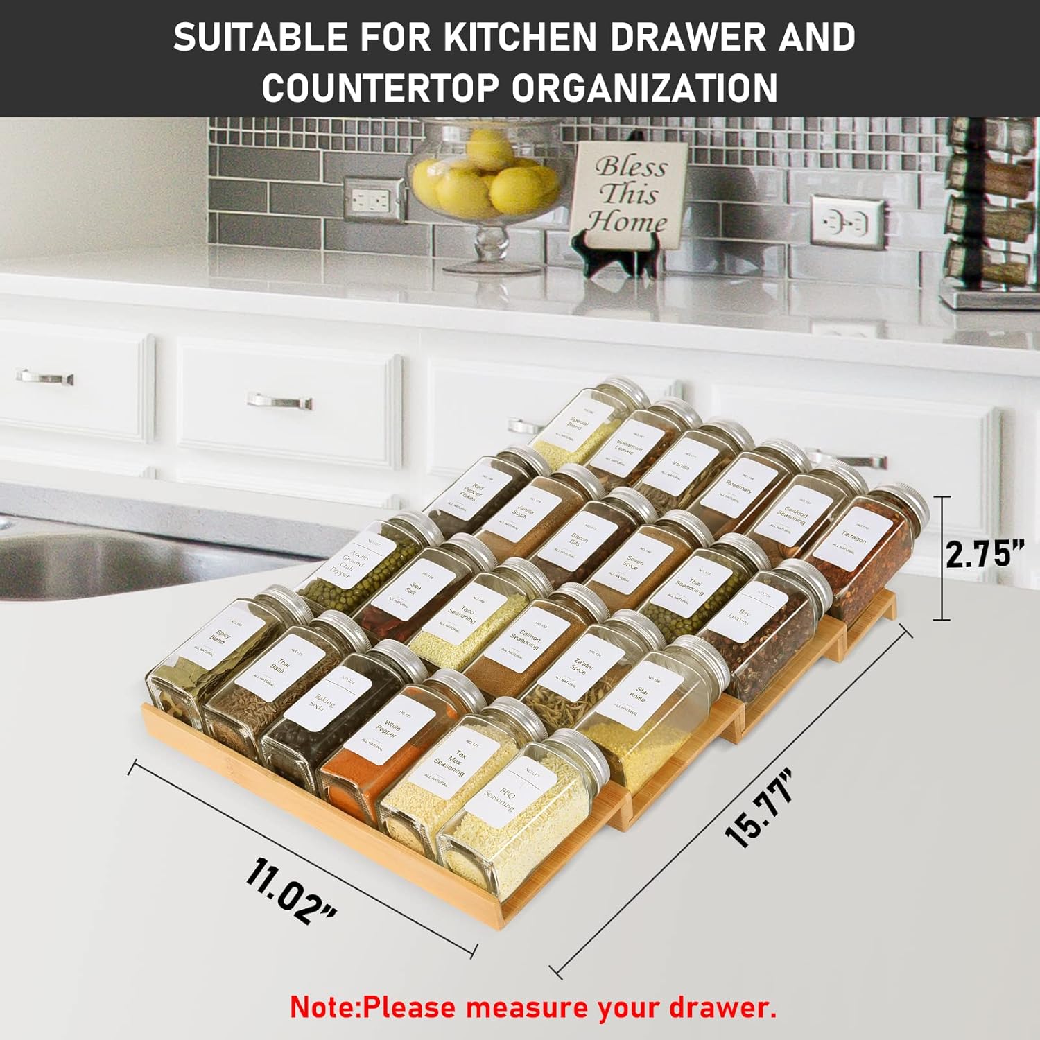 Spice Drawer Organizer with 20 Spice Jars,216 Labels,25 Non-slip Rubber, Bamboo 4 Tier Seasoning Rack Tray Insert for Kitchen Drawers,Cabinets,Countertop,11" Wide x 15.8" Deep