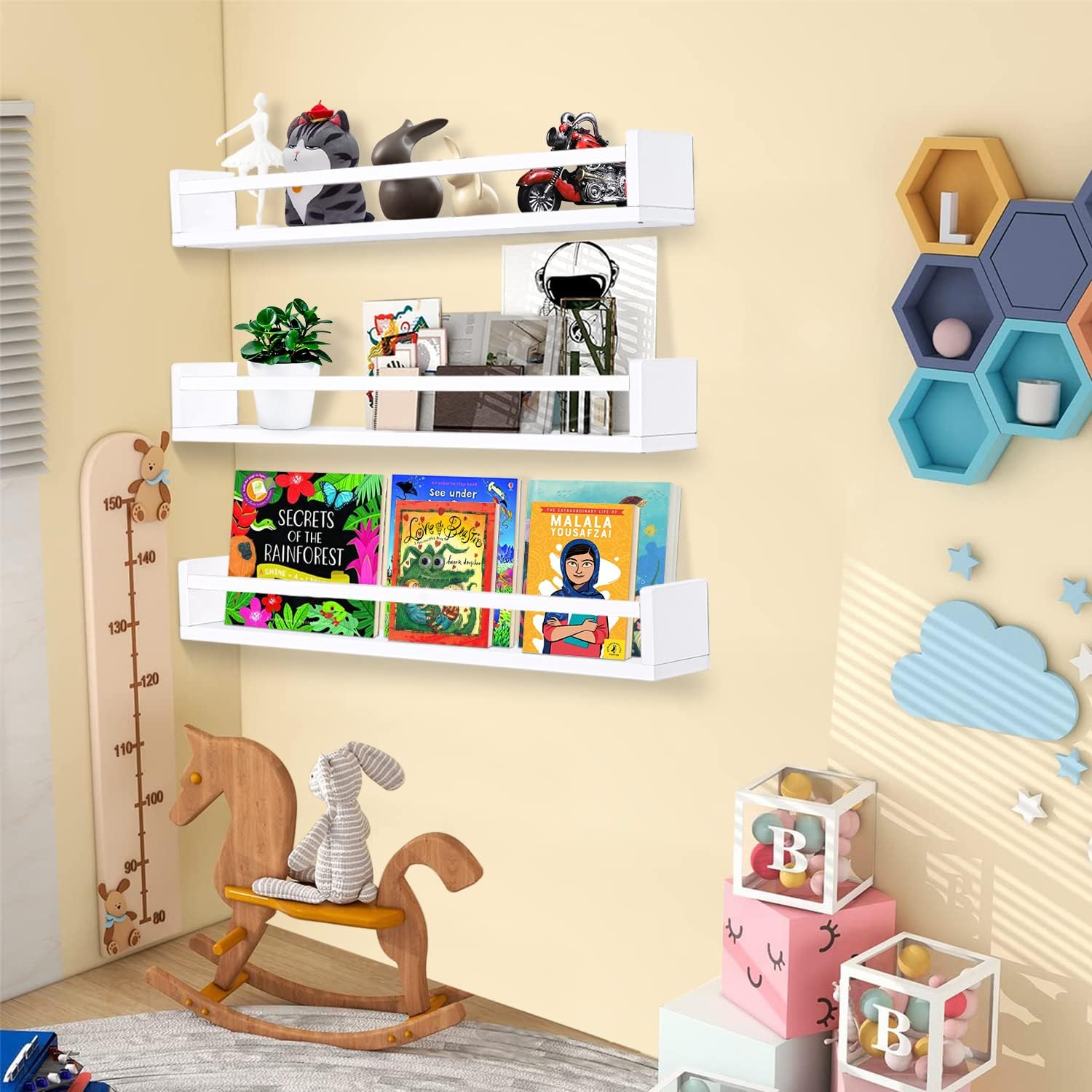 - Easy to Install: This set of floating wall bookshelves is easy to install, with the included installation instructions and hardware needed for installation, you just need to follow the instructions to fix the children's bookshelf on the wall. This set of children's storage and organizing shelves is also easy to clean, just wipe with a wet rag and then dry with a dry rag.