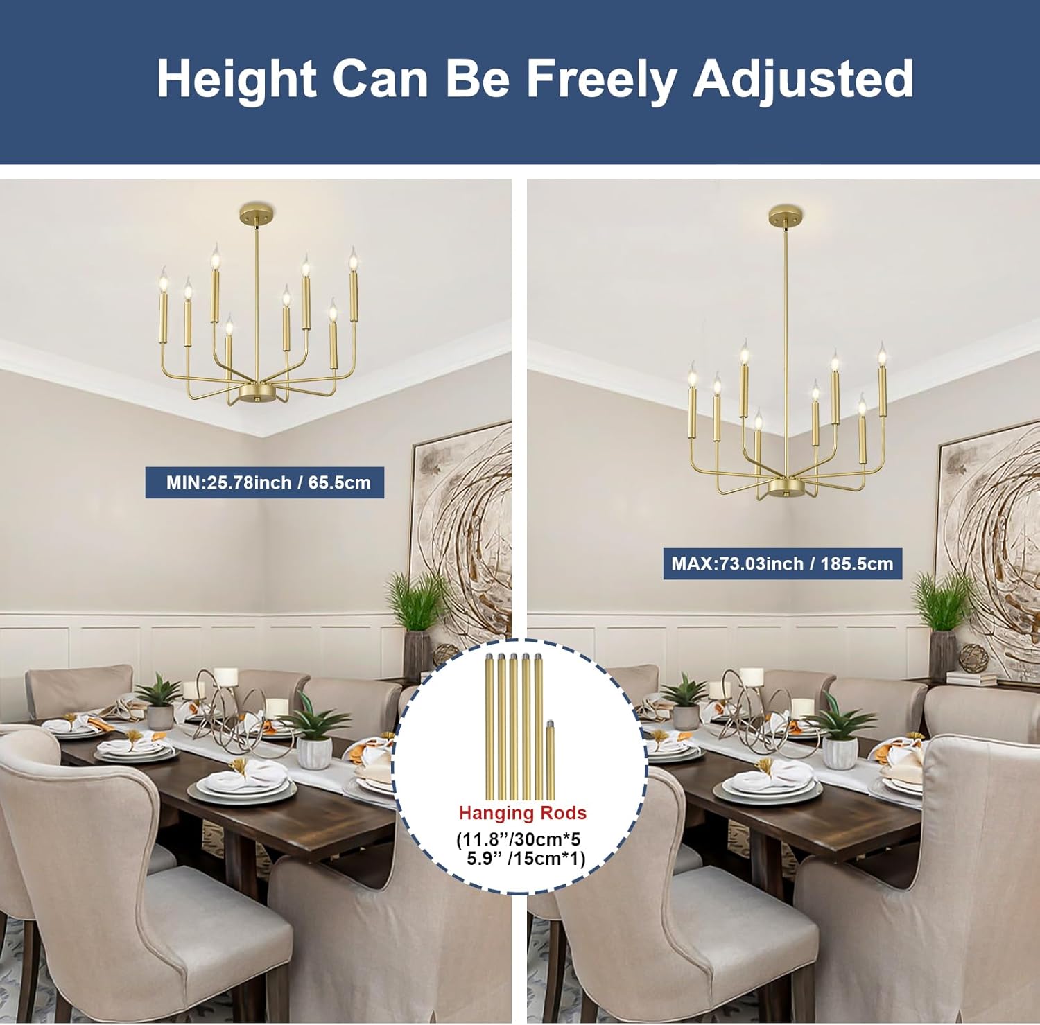 - Modern Fashion Design: A classy candelabra chandelier with different lengths of arms and gold matte finish which allows you to clean easily. The appearance of 8 uneven arms look genuine and novel. The whole minimalist design is classic but not rigid. With this simple and retro look can upgrade your space that is elegant but generous