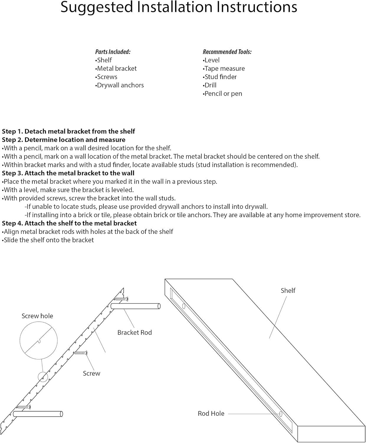 - WHAT YOU WILL GET: Shelf, installation bracket, screws, and anchors. To make the installation process effortless and quick, you will need: Tape measure, Stud finder, Pencil, Level, & Drill.