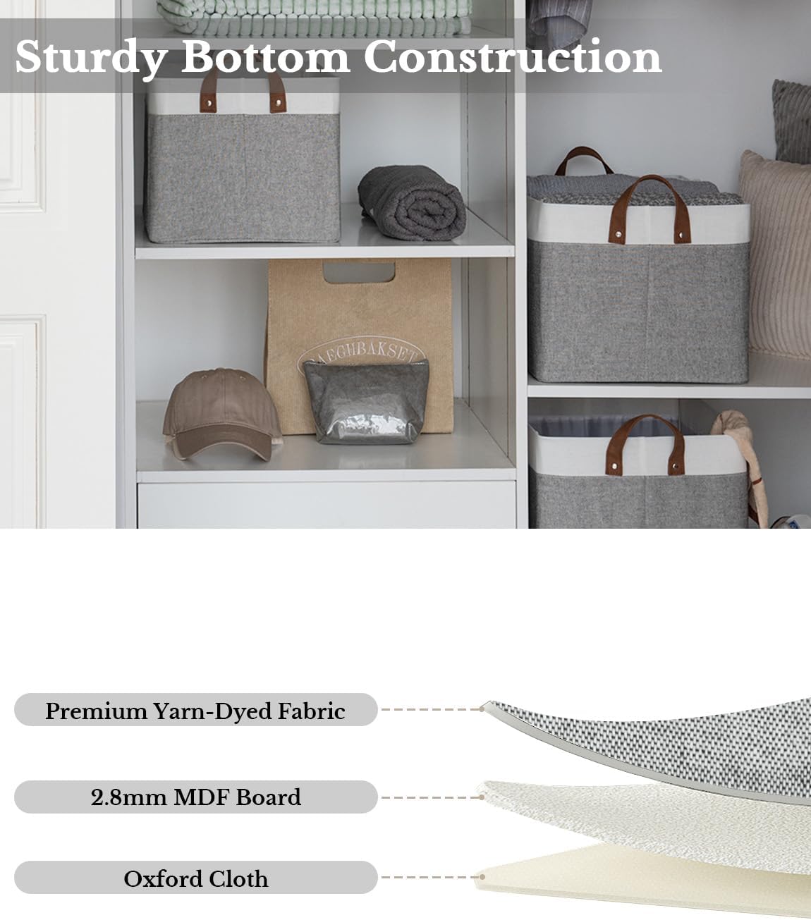 - Premium Quality: Made from high-quality fabric and reinforced with a heavy-duty MDF bottom board and a sturdy metal frame. The solid construction enables the storage bins to stand upright without support, even when empty.