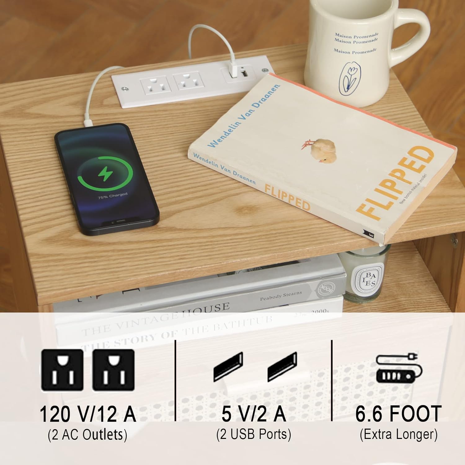- Bedside Tables with Charging Station: The plug contains 2 3-Prong Power outlets and 2 USB ports. It's easy to charge your phone, computer, any electric device etc. The power cod is 6.6 ft long, everything is within your arm's reach