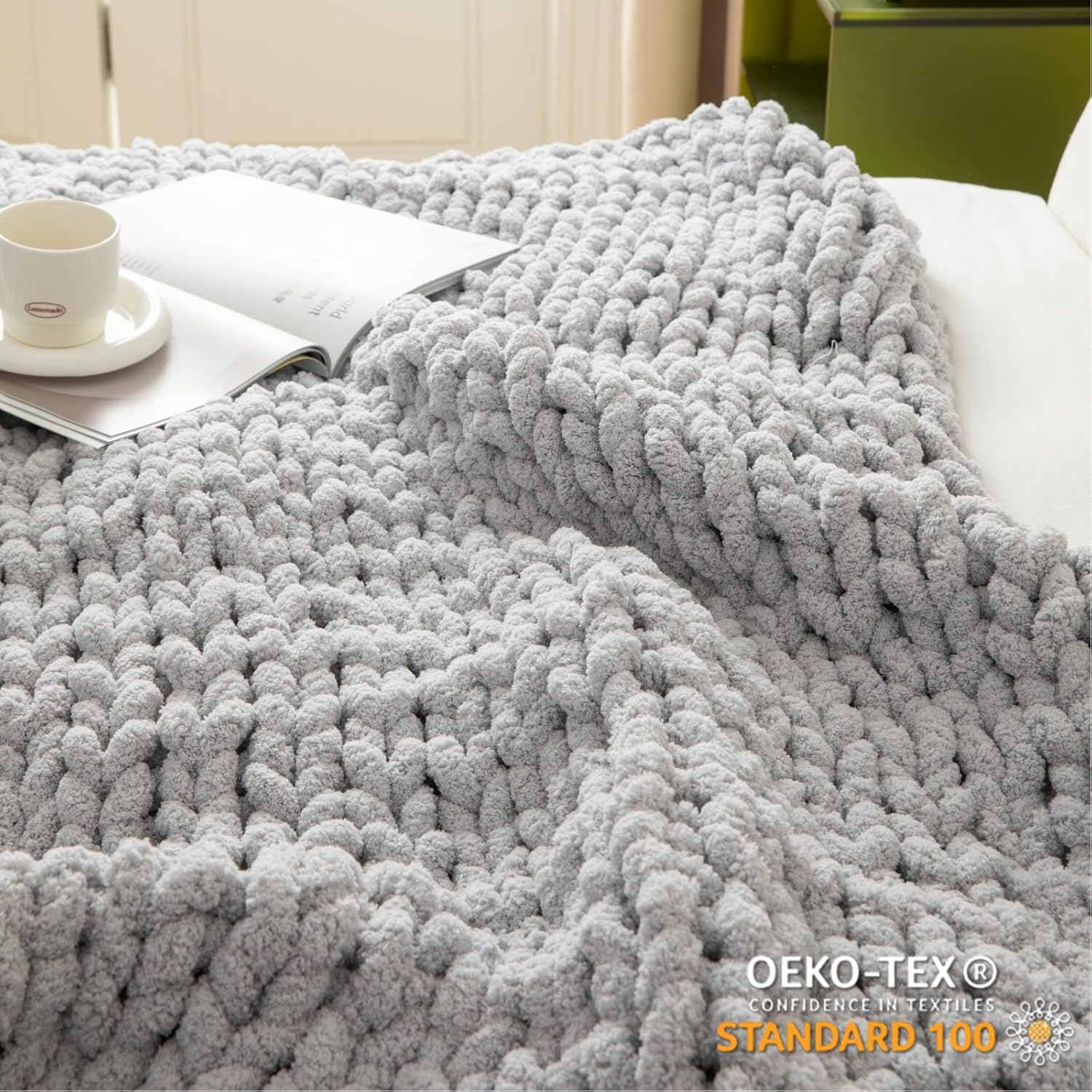 WESHIONGOO Chunky Knit Blanket Throw 50"×60" Knitted Throw Blankets for Couch Bed Fluffy Soft Blanket with Jumbo Chenille Yarn Thick 100% Handmade (Lingt Grey)