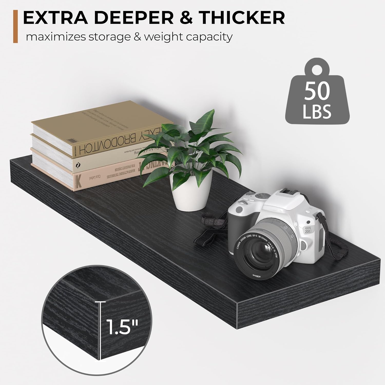 - Extra Deeper & Thicker - Each board measures 24"W x 9"D x 1.6"H. Extra deeper and thicker design in order to bring maximizes storage space and weight capacity, even hold up to 50 lb each. This floating shelf taking up zero square feet, reduces clutter and highlights décor in compact spaces.