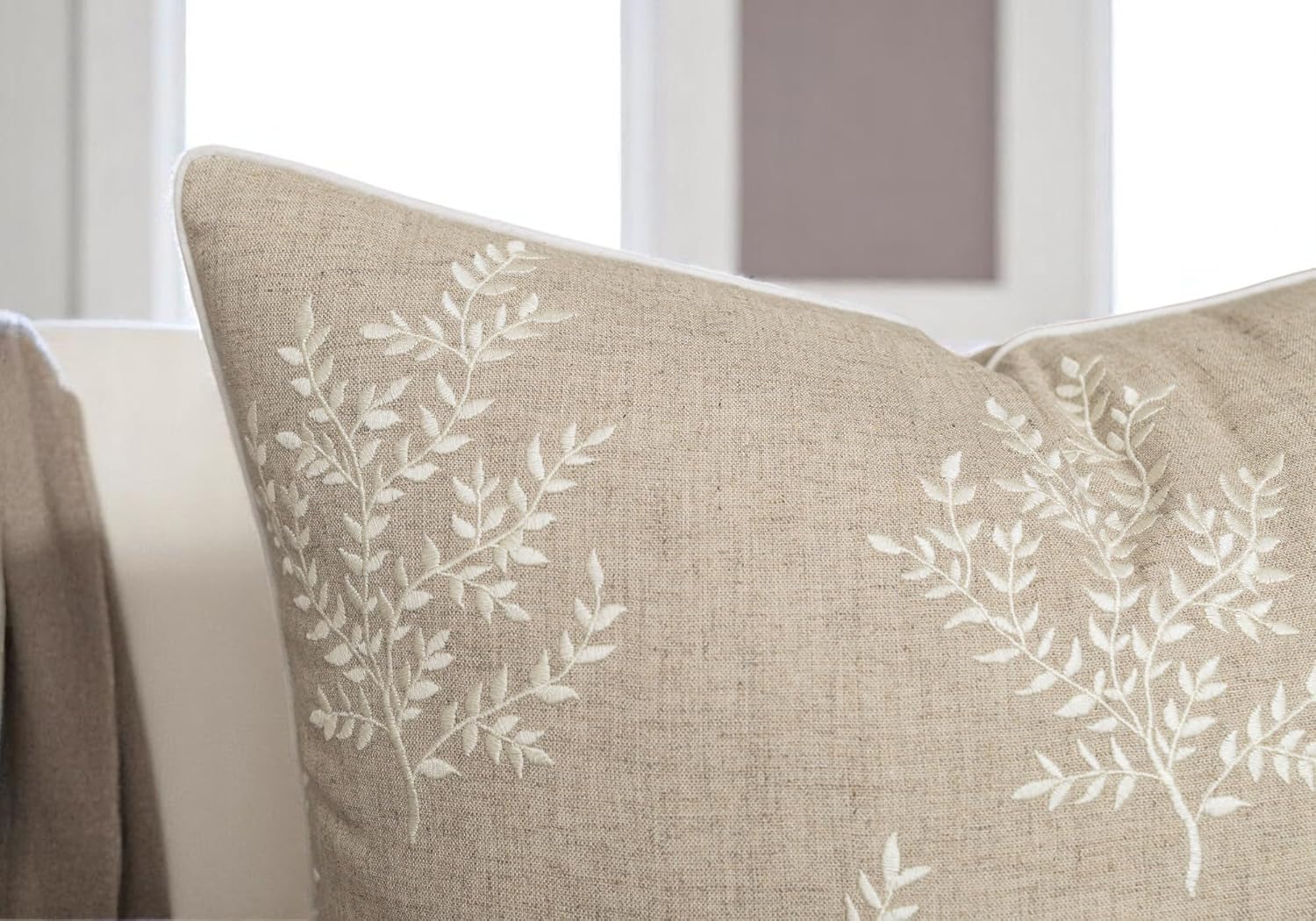 VAGMINE Embroidered Leaves Throw Pillow Cover - 20x20 Inches Square - 100% Linen Natural Throw Pillowcase - Elegant Neutral Leaf Design - Minimalist Rustic Home Accent for Sofa, Bed, Couch, Lounge