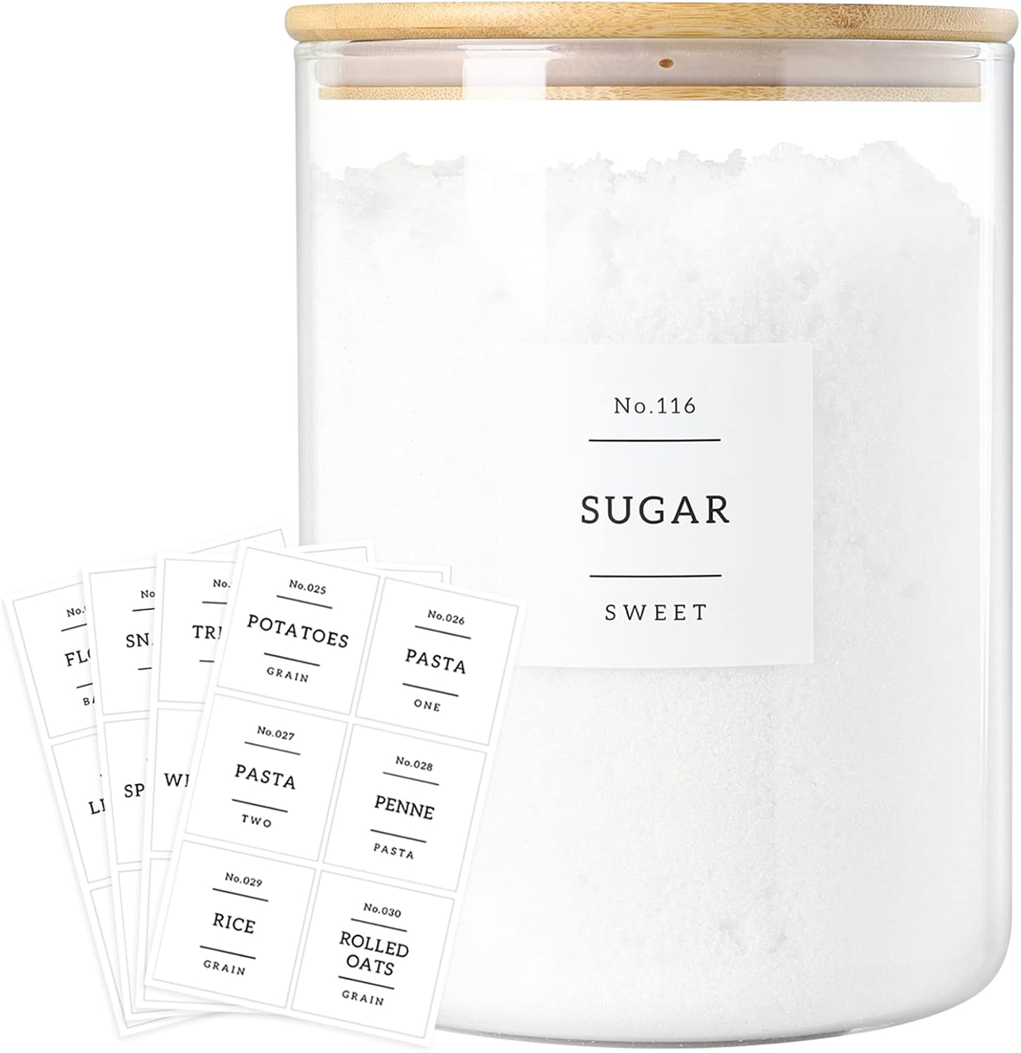 - PERFECT FOR PANTRY: Glass flour and sugar containers are great, but with minimalist labels preprinted they’re even better! So remember them as a mother’s day gift or housewarming gift for someone who loves kitchen organization and storage, too. Order your set of 1 large glass containers with lids and labels, now.