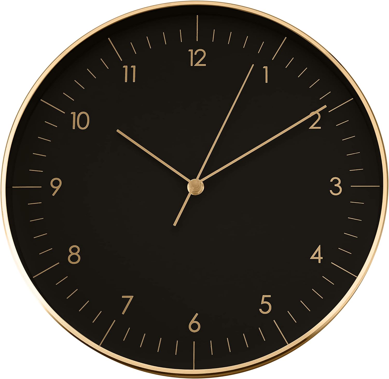 - SILENT MOVEMENT: This non-ticking quartz wall clock, featured in an elegant black and gold color, comes with a second hand and embodies a minimalist, Scandinavian design, The Arabic numerals are readable from a distance