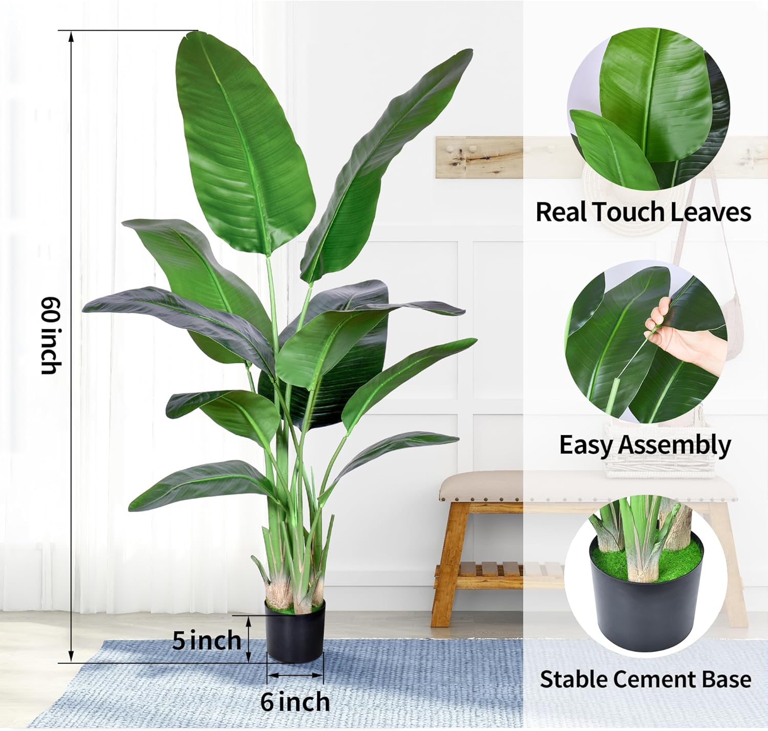2Packs 5FT Artificial Bird of Paradise Plant,Faux Palm Tree Potted Plant with Real Touch Leaves,Fake Trees for Home Living Room Office Indoor Outdoor Decor(5 FT-2Packs)