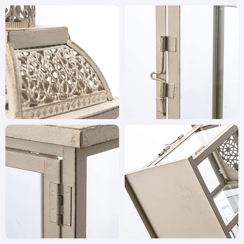 - STURDY BUILD - Four glass window panes let light flicker through and protect the flame from drafts. Strong metal frames distressed by white brush powdering for weather resistant use. Serves as rustic decoration indoor & outdoor, ideal for yard, pathway, driveway, shelf, table, bar, photo booths, patio, porch, etc. Place a candle(up to 5.5" diam) inside the lantern to illuminate your space in a soft and dreamy glow. Measures 5 1/2"Wx14 2/5"H.