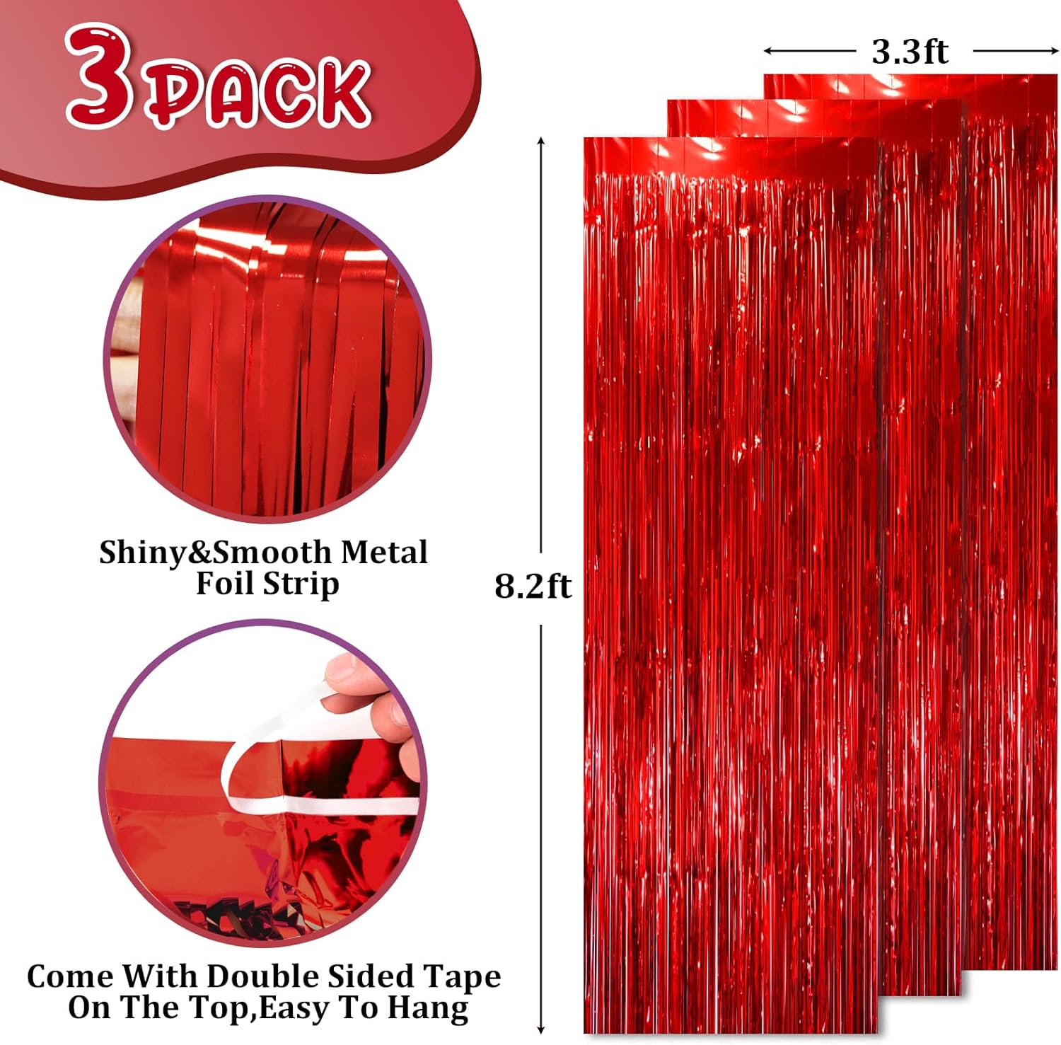 - Package Included: 3 packs of foil fringe curtains, the size of the foil curtain is 3.3*8.2 ft. It's long enough to fit any occasion. Please do not stick the foil curtain on uneven or stained walls to prevent it from falling off