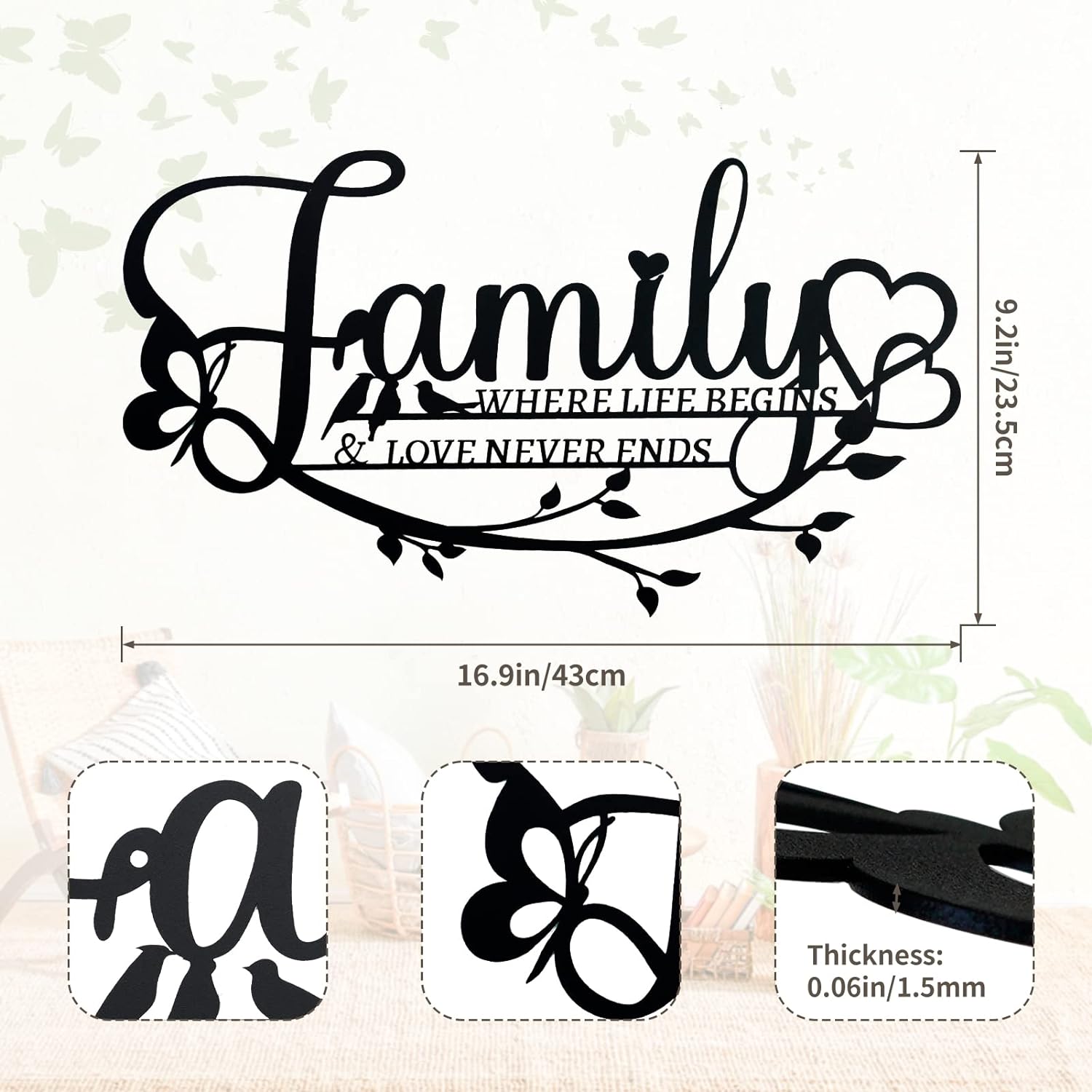 - Unique Design: Family Where Life Begins Love Never Ends: cause family is the soul of happiness. We design this black metal wall art to make the family more united and happier, adding the vivid elements of butterflies and birds to increase the love of life and warm atmosphere