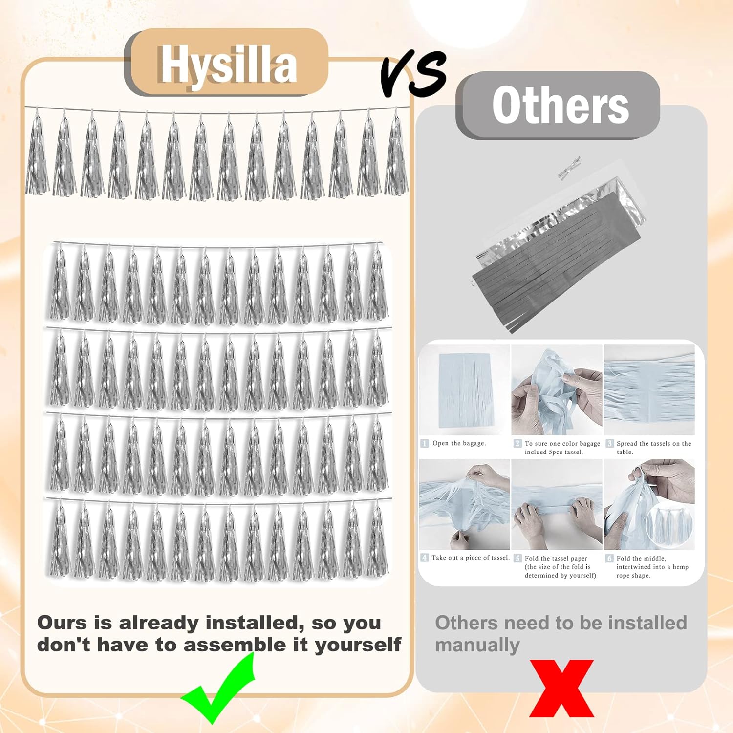 - 【Reusable Tassel Garland Material】: high-quality metallic foil tassel garlands, with the virtue of nice craftsmanship and lightweight, they are reusable and safe, and not easy to fade; They come with white ribbon for hanging, and garland tassels hang perpendicular to the string, and are adjustable to provide you with the option of spreading the tassels out or piecing them closer together.