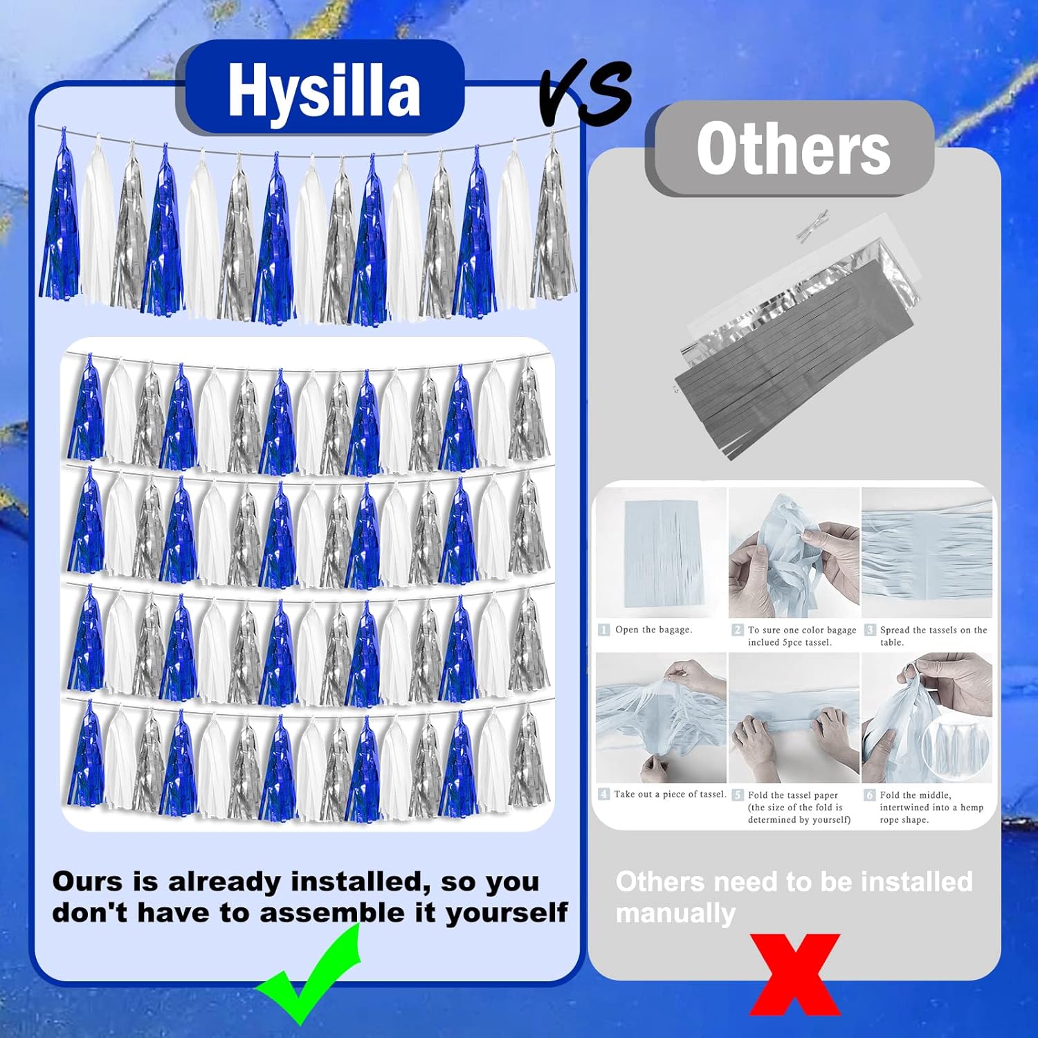 - 【Navy Blue White Silver Party Supplies Set】: The total length of the navy blue white silver birthday tassels banner is 39.3 feet, divided into 4 strips, each 9.8 feet long. Each banner contains 15 tassels, and each tassel measures 14 inches, for birthday decorations many occasions, and so on