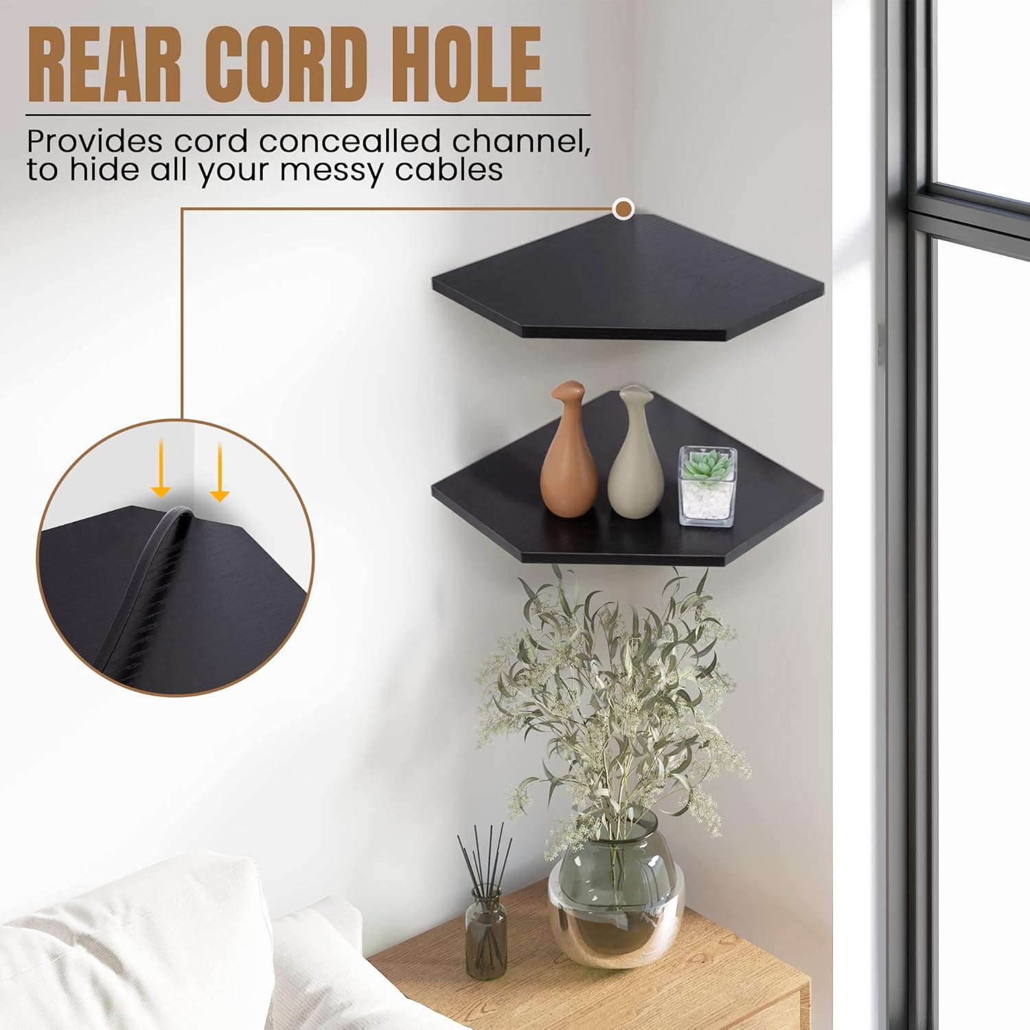 - ăSturdy Corner Floating Shelvesă Our Set of 2 Wooden Corner Shelf Wall Mounts are crafted with premium quality, heavy-duty composite wood making them incredibly durable, mildly waterproof, easy to wipe clean, and environmentally friendly. These corner shelves have been designed to withstand high weight-bearing capacity and can support up to 22 pounds for each tier, making them the perfect solution for all your storage needs