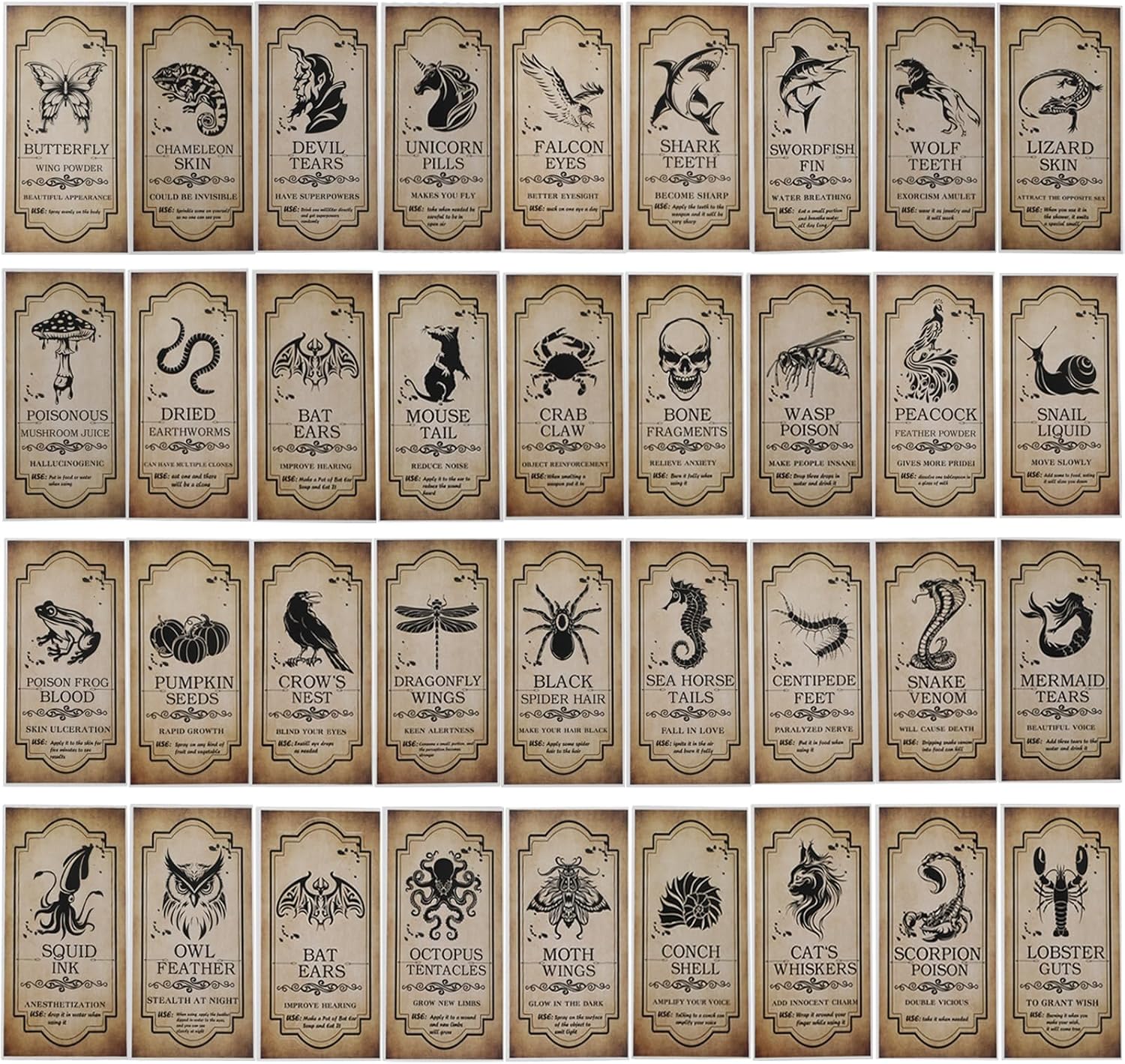 - Package Includes: The Halloween bottle labels set includes 144pcs animal apothecary stickers with 36 different styles,ach style with 4 pieces.Each Halloween medicine glass label stickers are approx. 8.5 x 4.5 cm / 3.3 x 1.8 inch,which is suitable for small size wine bottles or glass bottles.
