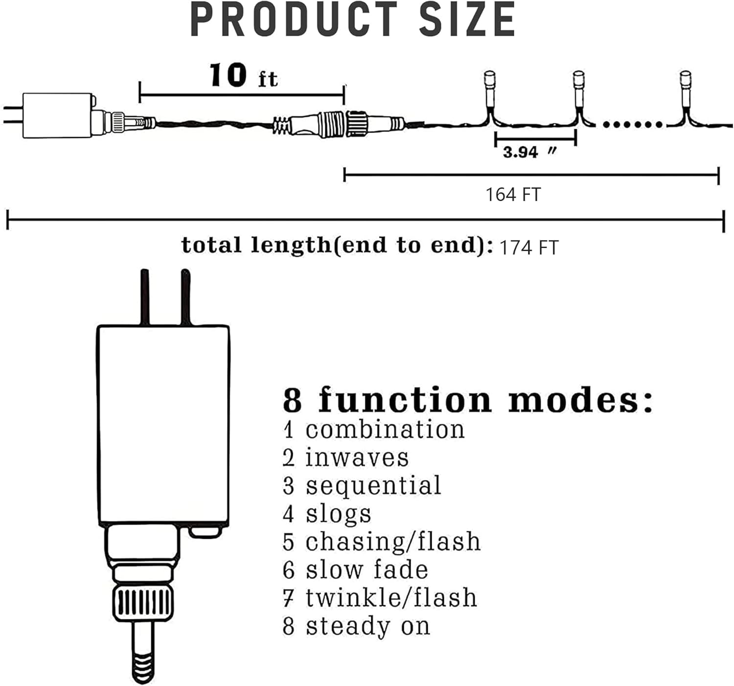 - Specification: Halloween 500 LED string lights, The outdoor lights has 10 FT leading wire, and the light string is 164 FT, total length is 174 FT, the bulb spacing is 3.94 inch.