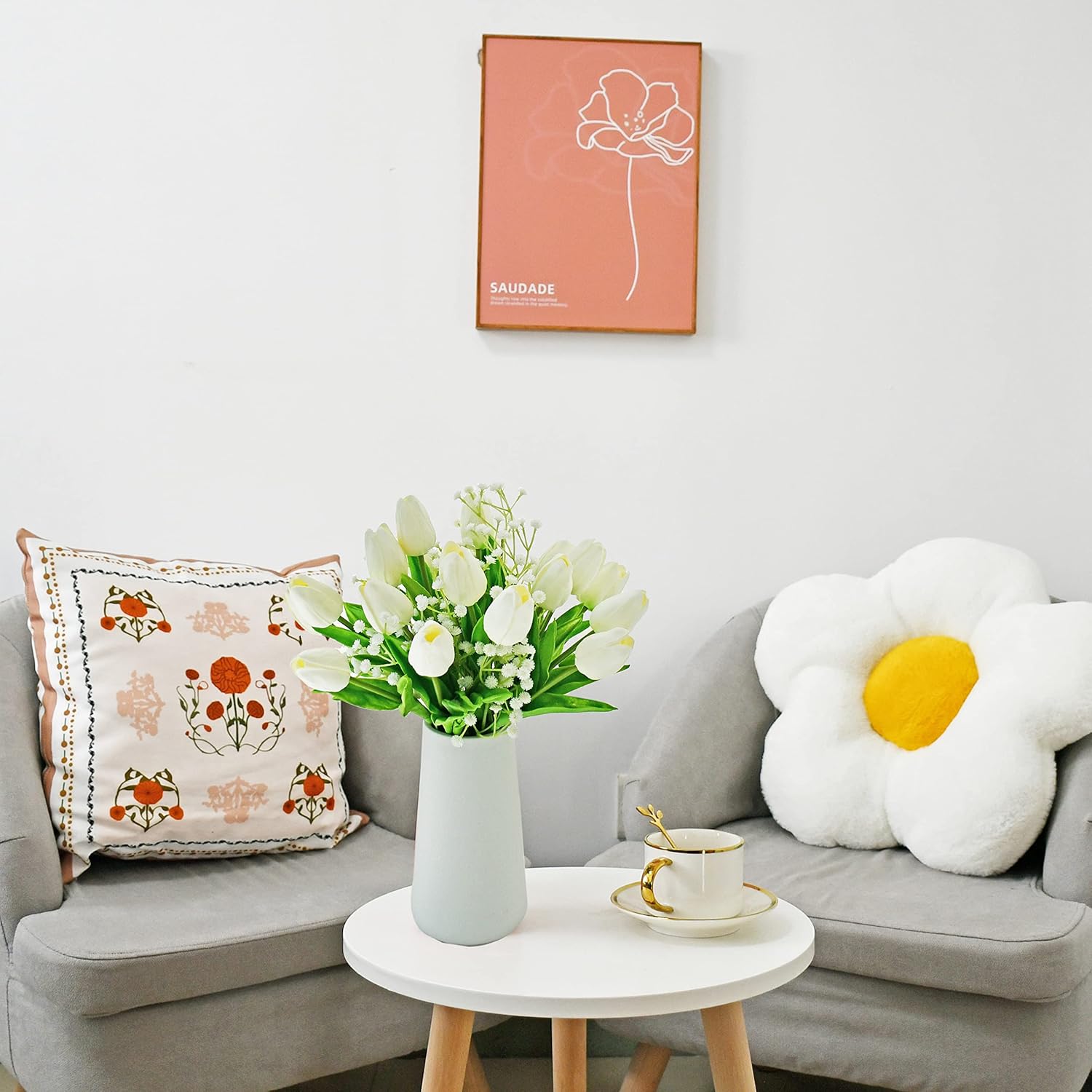 - All-Season Beauty with Gentle Color Care.These tulips bring timeless charm to Easter, Mother’s Day, weddings, or year-round décor. To preserve the soft tones of light-colored flowers—especially white—we recommend avoiding direct sunlight for long-term (6+ months) display, as PU petals may naturally yellow over time.