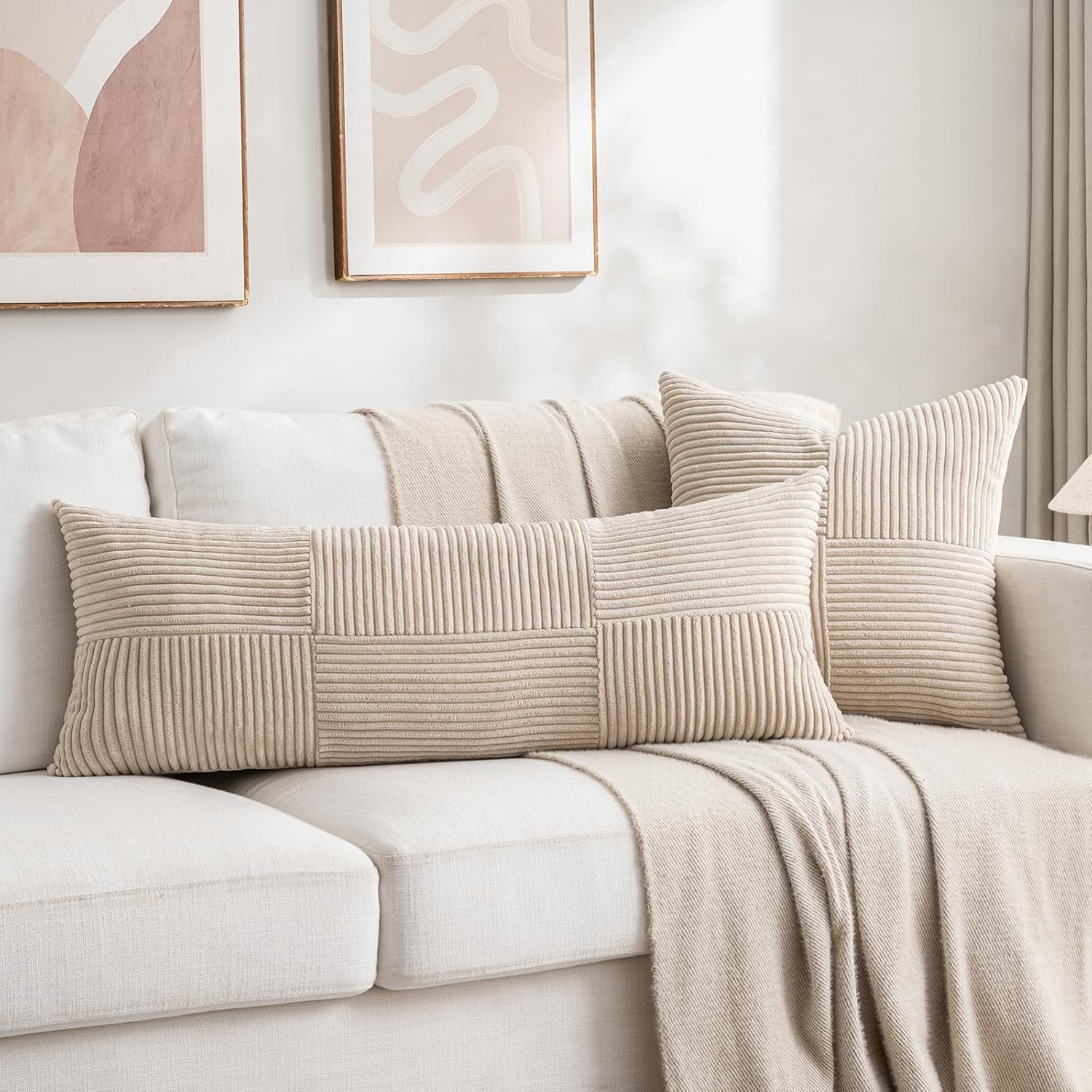 Fancy Homi 2 Packs Tan Decorative Throw Pillow Covers 16x16 Inch for Living Room Couch Bed Sofa, Farmhouse Boho Home Decor, Soft Corss Patchwork Corduroy Textured Square Beige Cushion Case 40x40 cm