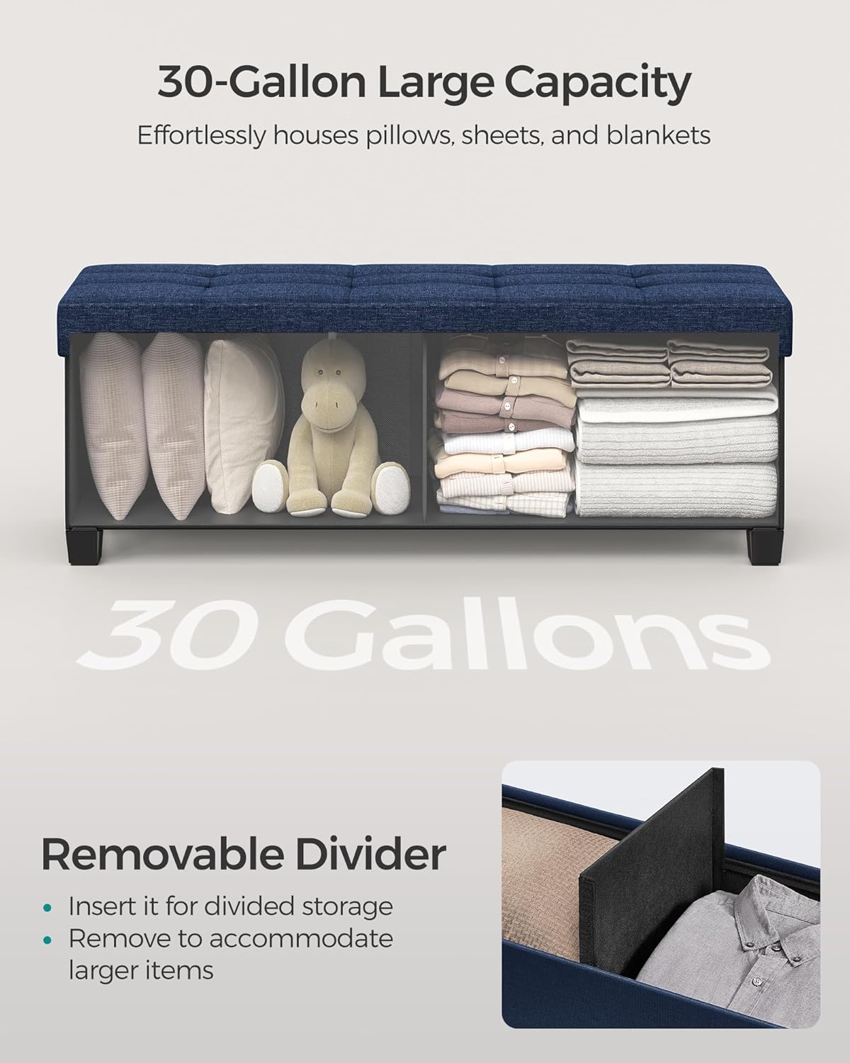 - 【SPACIOUS STORAGE】Sized at 15"D x 43"W x 15.7"H (38 x 110 x 40 cm), this end of bed bench offers a 30-gallon (112 L) volume for your blankets, books, and bed sheets. A removable divider is included to keep you items neatly sorted